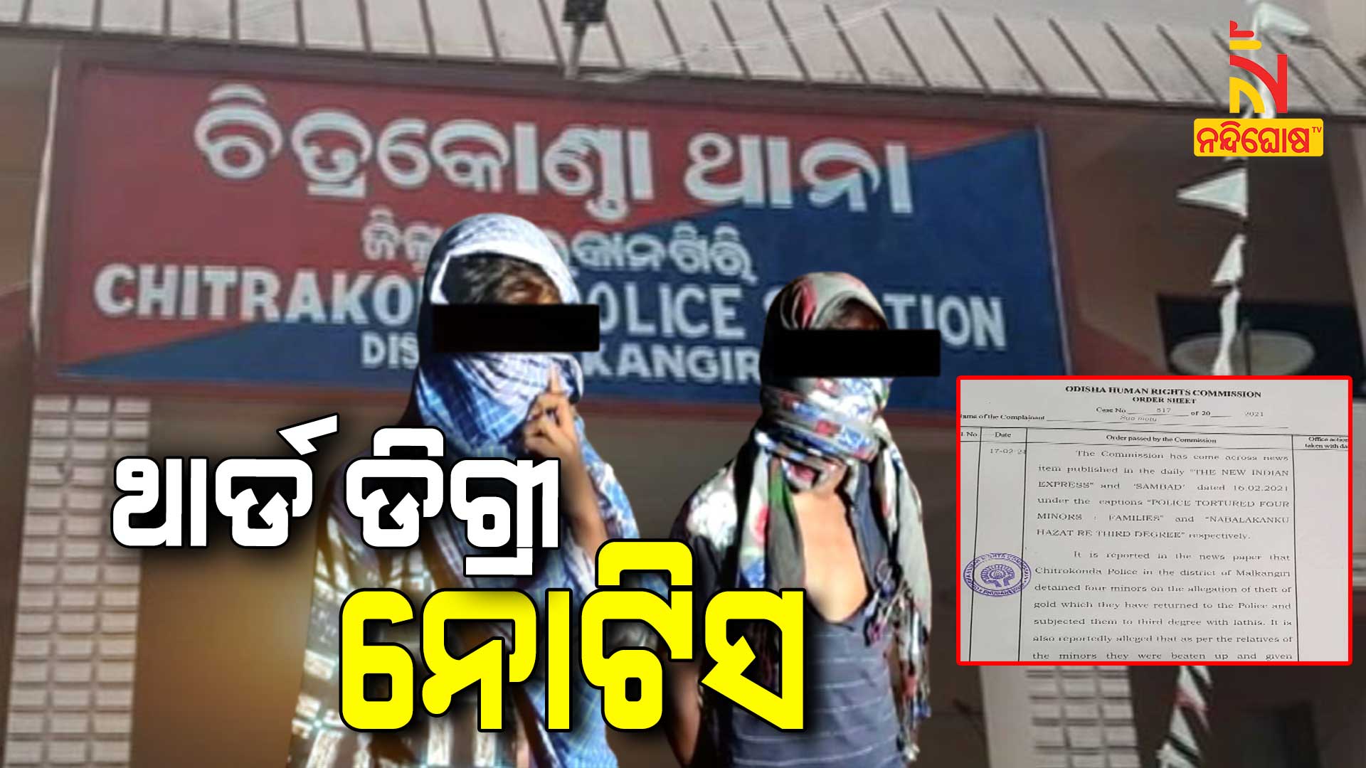 ଚିତ୍ରକୋଣ୍ଡା: ମାଲକାନଗିରି ଚିତ୍ରକୋଣ୍ଡା ପୋଲିସର ନାବାଳକଙ୍କୁ ଥାର୍ଡ ଡିଗ୍ରୀ ଘଟଣା । ଗଣମାଧ୍ୟମରେ ଏ ନେଇ ଖବର ପ୍ରସାରିତ ହେବା ପରେ ନିଜ ଆଡୁ ମାମଲା ରୁଜୁ କରିଛି ଓଡ଼ିଶା ମାନବାଧିକାର କମିଶନ । ଘଟଣାର ତଦନ୍ତ କରି ଆସନ୍ତା ମାର୍ଚ୍ଚ ୩୦ ତାରିଖ ସୁଦ୍ଧା ରିପୋର୍ଟ ଦାଖଲ କରିବାକୁ ମାଲକାନଗିରି ଏସପିଙ୍କୁ ନୋଟିସ୍ ଜାରି କରିଛନ୍ତି କମିଶନ ।