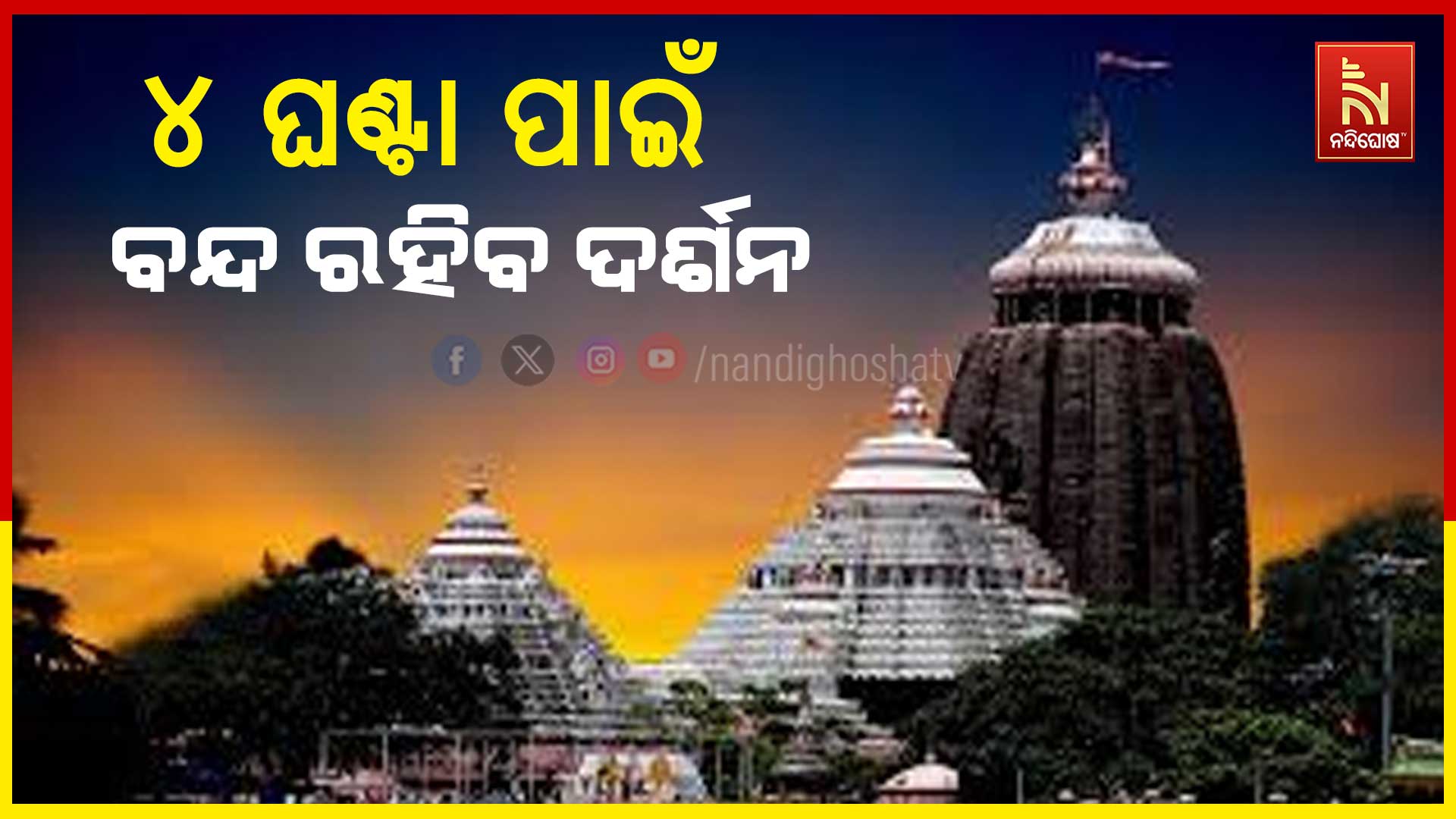 ପୁରୀ: ଆଜି ଶ୍ରୀମନ୍ଦିରରେ ପ୍ରାୟ ୪ ଘଣ୍ଟା ପାଇଁ ବନ୍ଦ ରହିବ ସର୍ବସାଧାରଣ ଦର୍ଶନ । ଏନେଇ ଶ୍ରୀମନ୍ଦିର ପ୍ରଶାସନ ପକ୍ଷରୁ ସୂଚନା ପ୍ରଦାନ କରାଯାଇଅଛି।