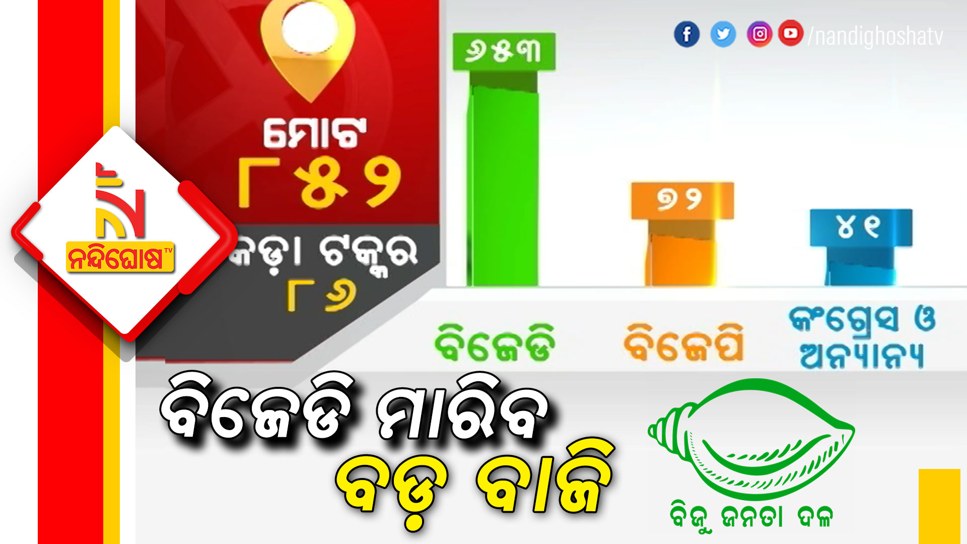 ତେବେ ନନ୍ଦିଘୋଷ ଟିଭି EXIT POLL ଅନୁଯାୟୀ ଅନୁଗୁଳର ୨୮ଜିଲ୍ଲା ପରିଷଦ ଆସନରୁ ବିଜେଡିକୁ ୧୯, ବିଜେପିକୁ ୬ଆସନ ମିଳିପାରେ । ୩ଟିରେ କଡ଼ା ମୁକାବିଲା ଦେଖିବାକୁ ମିଳିବ । ବାଲେଶ୍ୱରର ୪୫ଜିଲ୍ଲା ପରିଷଦ ଆସନରୁ ବିଜେଡିକୁ ୩୪, ବିଜେପିକୁ ୫, କଂଗ୍ରେସକୁ ୨ଆସନ ମିଳିପାରେ । ୪ଆସନରେ କଡ଼ା ମୁକାବିଲା ହୋଇପାରେ । ବରଗଡ଼ର ୩୪ ଜିଲ୍ଲା ପରିଷଦ ଆସନ ମଧ୍ୟରୁ ବିଜେଡି ଖାତାକୁ ଯାଇପାରେ ୨୭ ଓ ବିଜେପିକୁ ୩ଆସନ ମିଳିପାରେ । ୪ଆସନରେ ହୋଇପାରେ କଡ଼ା ମୁକାବିଲା । ଭଦ୍ରକର ୨୮ଜିଲ୍ଲା ପରିଷଦ ଆସନରୁ ୨୬ଆସନରେ ଜିତିପାରେ ବିଜେଡି, ଅନ୍ୟ ୨ଟି ଆସନରେ କଡ଼ା ଟକ୍କର । ବଲାଙ୍ଗୀରର ୩୪ଜିଲ୍ଲା ପରିଷଦ ଆସନ ମଧ୍ୟରୁ ବିଜେଡି ୧୯, କଂଗ୍ରେସ ୬, ବିଜେପି ୫ଆସନରେ ଜିତିପାରେ । ୪ଆସନରେ କଡ଼ା ମୁକାବିଲା ହୋଇପାରେ । କଟକର ୪୬ଜିଲ୍ଲା ପରିଷଦ ଆସନରୁ ବିଜେଡି ୩୮, ବିଜେପି ୪, କଂଗ୍ରେସକୁ ୧ଆସନ ମିଳିପାରେ ।