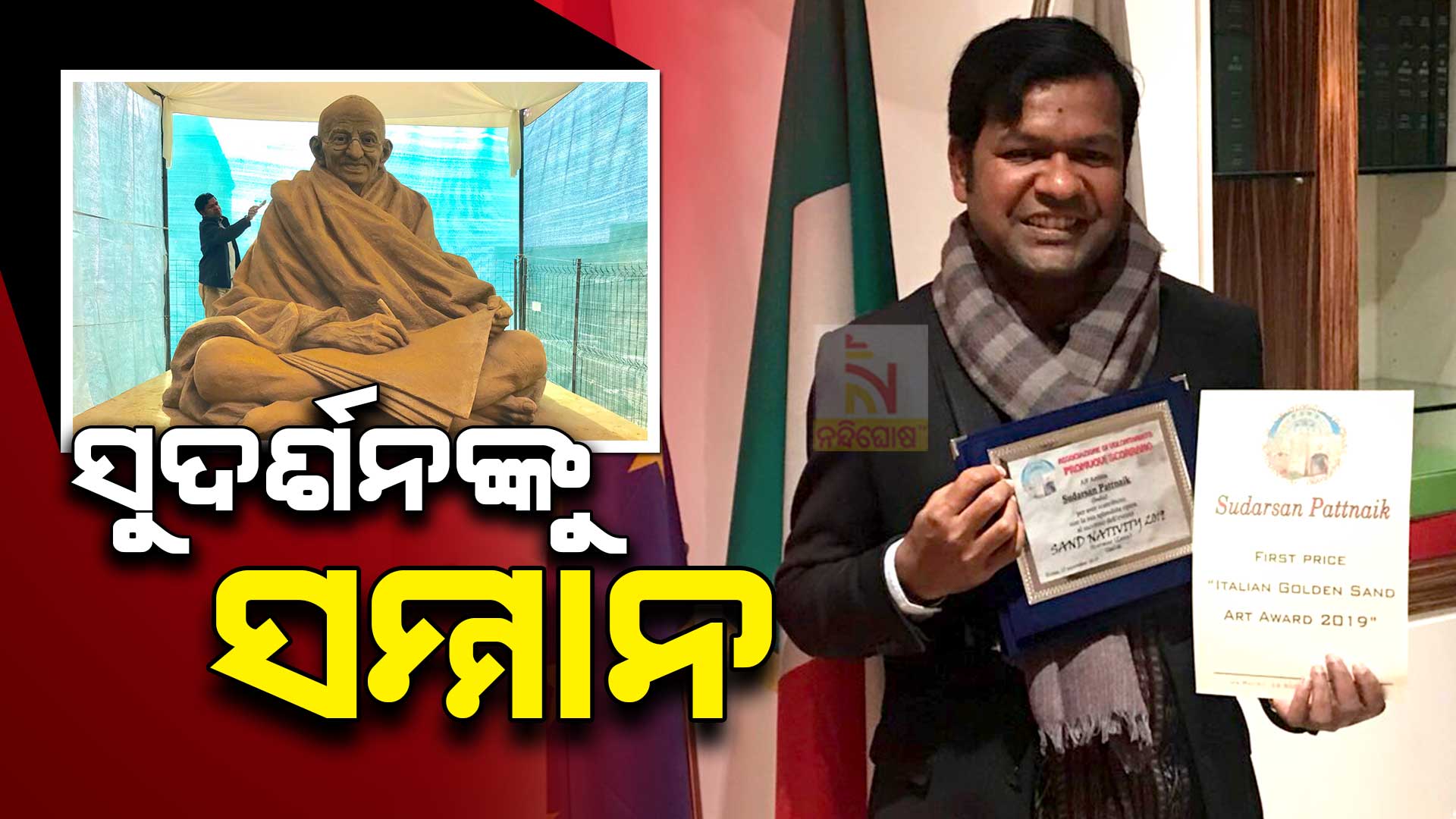 ଅନ୍ତର୍ଜାତୀୟ ସମ୍ମାନରେ ସମ୍ମାନିତ ହେଲେ ବାଲୁକା ଶିଳ୍ପୀ ସୁଦର୍ଶନ ପଟ୍ଟନାୟକ। ପ୍ରଥମ ବାଲୁକା ଶିଳ୍ପୀ ଭାବେ ସୁଦର୍ଶନଙ୍କୁ ମିଳିଛି ‘ଇଟାଲିୟନ ଗୋଲ୍ଡେନ ସ୍ୟାଣ୍ଡ ଆର୍ଟ ଆଓ୍ୱାର୍ଡ-୨୦୧୯’। ଇଟାଲିର ରୋମ୍ରେ ଆୟୋଜିତ ‘ଅନ୍ତର୍ଜାତୀୟ ସ୍କୋରାନା ନେଟିଭିଟି’ ଉତ୍ସବରେ ଏପରି ସମ୍ମାନରେ ସମ୍ମାନିତ ହୋଇଛନ୍ତି ସୁଦର୍ଶନ। ଏହି ଉତ୍ସବରେ ଭାରତୀୟ ହାଇକମିଶନର ଉପମୁଖ୍ୟ ନିହାରିକା ସିଂହ ମଧ୍ୟ ଉପସ୍ଥିତ ଥିଲେ। ପ୍ରଥମ ବାଲୁକା ଶିଳ୍ପୀ ଭାବେ ସୁଦର୍ଶନଙ୍କୁ ଏହି ସମ୍ମାନ ମିଳିଛି।