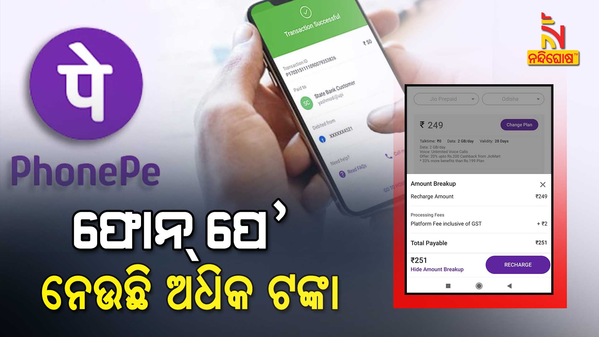 ଆପଣ ଯଦି ୫୦ ଟଙ୍କାରୁ କମ୍ ଟଙ୍କା ଫୋନ୍ରେ ରିଚାର୍ଜ କରୁଛନ୍ତି ତେବେ କୌଣସି ଦେୟ ଦେବାକୁ ପଡ଼ିବ ନାହିଁ। କିନ୍ତୁ ୫୦ ଟଙ୍କାରୁ ଅଧିକ ଏବଂ ୧୦୦ ଟଙ୍କାରୁ କମ୍ ରିଚାର୍ଜ କଲେ ଆପଣଙ୍କୁ ୧ ଟଙ୍କା ଏବଂ ୧୦୦ ଟଙ୍କାରୁ ଅଧିକ ଟଙ୍କାର ରିଚାର୍ଜ କଲେ ଆପଣଙ୍କୁ ୨ ଟଙ୍କା ଦେୟ ଦେବାକୁ ପଡ଼ିବ। ସେପଟେ ଫୋନ୍ ପେ’ ମୁଖପାତ୍ର କହିଛନ୍ତି , ଦେୟ ନେଉଥିବା ଏହା ପ୍ରଥମ ପେମେଣ୍ଟ ପ୍ଲାଟଫର୍ମ ନୁହେଁ । ବରଂ ବିଲ୍ ପେମେଣ୍ଟ ଉପରେ ଏହା ଏକ ଛୋଟ ଚାର୍ଜ କରୁଥିବା ଏକ ଷାଣ୍ଡାର୍ଡ ପ୍ରାକ୍ଟିସ୍ । ଏବଂ କମ୍ପାନୀ କେବଳ କ୍ରେଡିଟ୍ କାର୍ଡରୁ ପେମେଣ୍ଟରେ ପ୍ରୋସେସିଂ ଫିସ୍ ନେବ ବୋଲି ସୂଚନା ଦେଇଛି । କିନ୍ତୁ ଯେକୌଣସି କାର୍ଡରୁ ପେମେଣ୍ଟ ବେଳେ ପ୍ରୋସେସିଂ ଫି’ ନିଆଯାଉଥିବା ଦେଖିବାକୁ ମିଳିଛି । ସୂଚନା ଥାଉ କି, ବର୍ତ୍ତମାନ ସମୟରେ ପାଖାପାଖି ୩୦୦ ମିଲିୟନରୁ ଅଧିକ ୟୁଜର୍ସ ଫୋନ୍ ପେ’ ବ୍ୟବହାର କରୁଛନ୍ତି।