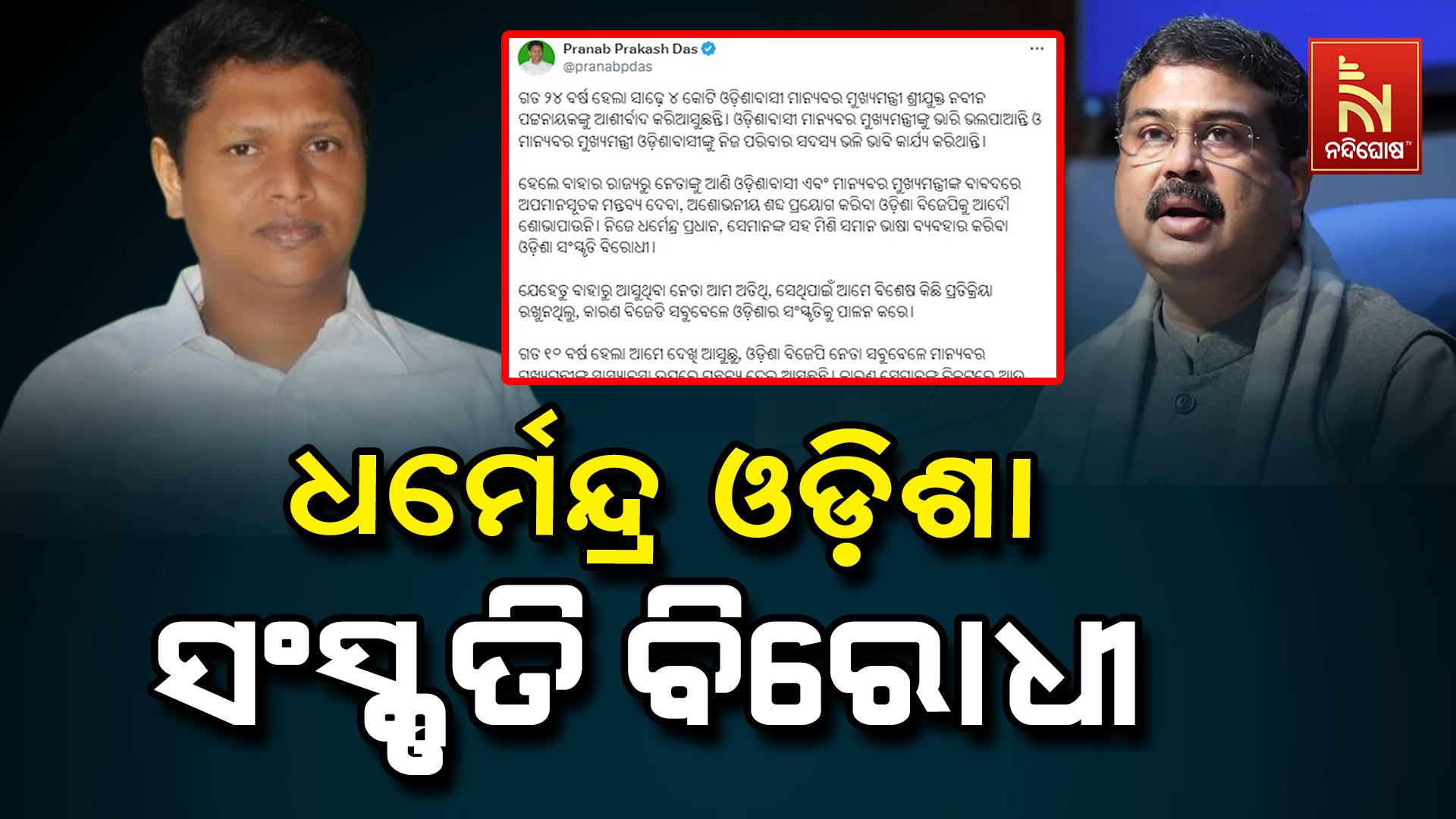 ସମ୍ବଲପୁର: ପୁଣି କେନ୍ଦ୍ରମନ୍ତ୍ରୀ ତଥା ସମ୍ବଲପୁର ସାଂସଦ ପ୍ରାର୍ଥୀ ଧର୍ମେନ୍ଦ୍ର ପ୍ରଧାନଙ୍କୁ ଶାଣିତ ସମାଲୋଚନା କଲେ ପ୍ରଣବ ପ୍ରକାଶ ଦାସ । କହିଲେ- ବାହାର ରାଜ୍ଯର ନେତାଙ୍କ ସହ ମିଶି ମୁଖ୍ୟମନ୍ତ୍ରୀ ନବୀନ ପଟ୍ଟନାୟକଙ୍କ ବାବଦରେ ଅପମାନସୂଚକ ମନ୍ତବ୍ୟ ଦେଇଛନ୍ତି ଧର୍ମେନ୍ଦ୍ର । ଓଡ଼ିଶା ସଂସ୍କୃତି ବିରୋଧୀ କହି ଧର୍ମେନ୍ଦ୍ରଙ୍କୁ ଟାର୍ଗେଟ କରିଛନ୍ତି ପ୍ରଣବ ।
