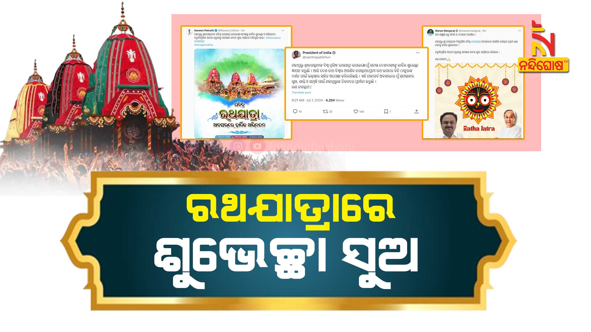 ବିଜେଡି ସୁପ୍ରିମୋ ନବୀନ ପଟ୍ଟନାୟକ ପବିତ୍ର ରଥଯାତ୍ରା ଉପଲକ୍ଷେ ସମସ୍ତଙ୍କୁ ଶୁଭେଚ୍ଛା ଓ ଅଭିନନ୍ଦନ ଜଣାଇଛନ୍ତି । ଚତୁର୍ଦ୍ଧାମୂର୍ତ୍ତିଙ୍କ ଅପାର କରୁଣାରୁ ସମସ୍ତଙ୍କ ଜୀବନ ସୁଖଶାନ୍ତିରେ ପରିପୂର୍ଣ୍ଣ ହେଉ ବୋଲି ନବୀନ ଶୁଭେଚ୍ଛା ଜଣାଇଛନ୍ତି । ମହାପ୍ରଭୁ ଜଗନ୍ନାଥଙ୍କ ପବିତ୍ର ରଥଯାତ୍ରା ଅବସରରେ ଅଗଣିତ ଜଗନ୍ନାଥ ପ୍ରେମୀଙ୍କୁ ଶୁଭକାମନା ଜଣାଇଛନ୍ତି ସାଂସଦ ମାନସ ମଙ୍ଗରାଜ ।