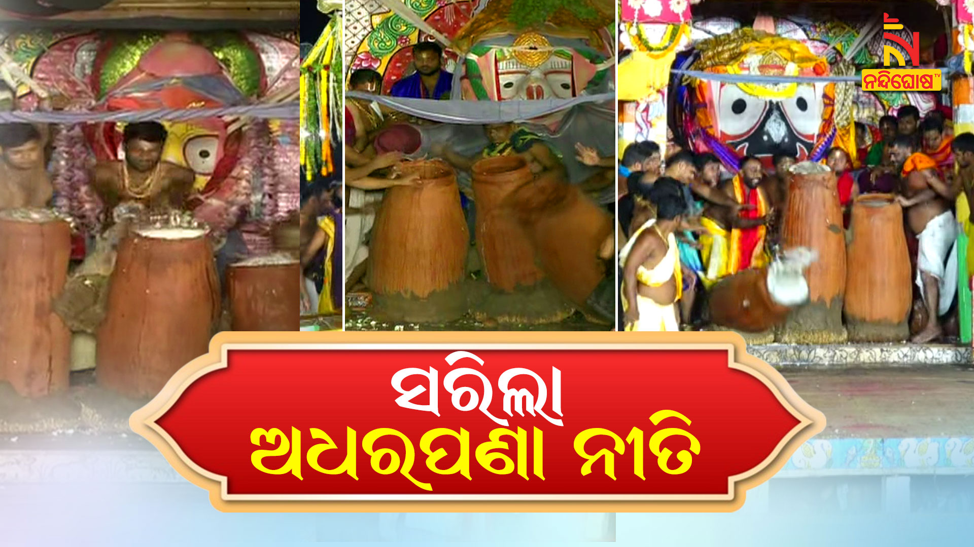 ପୁରୀ: ରଥଯାତ୍ରାର ଅନ୍ୟତମ ନୀତି ଅଧରପଣା ଶେଷ ହୋଇଛି । ରଥାରୂଢ଼ ତିନି ଠାକୁରଙ୍କ ପାଖରେ ଯଥାରୀତି ଅଧରପଣା ନୀତି ସମ୍ପନ୍ନ କରିଛନ୍ତି ସେବାୟତ । ମହାପ୍ରଭୁଙ୍କ ଏହି ନୀତି ଦେଖିବାକୁ ପୁରୀରେ ଲକ୍ଷାଧିକ ଭକ୍ତଙ୍କ ସମାଗମ ହୋଇଥିଲା ।