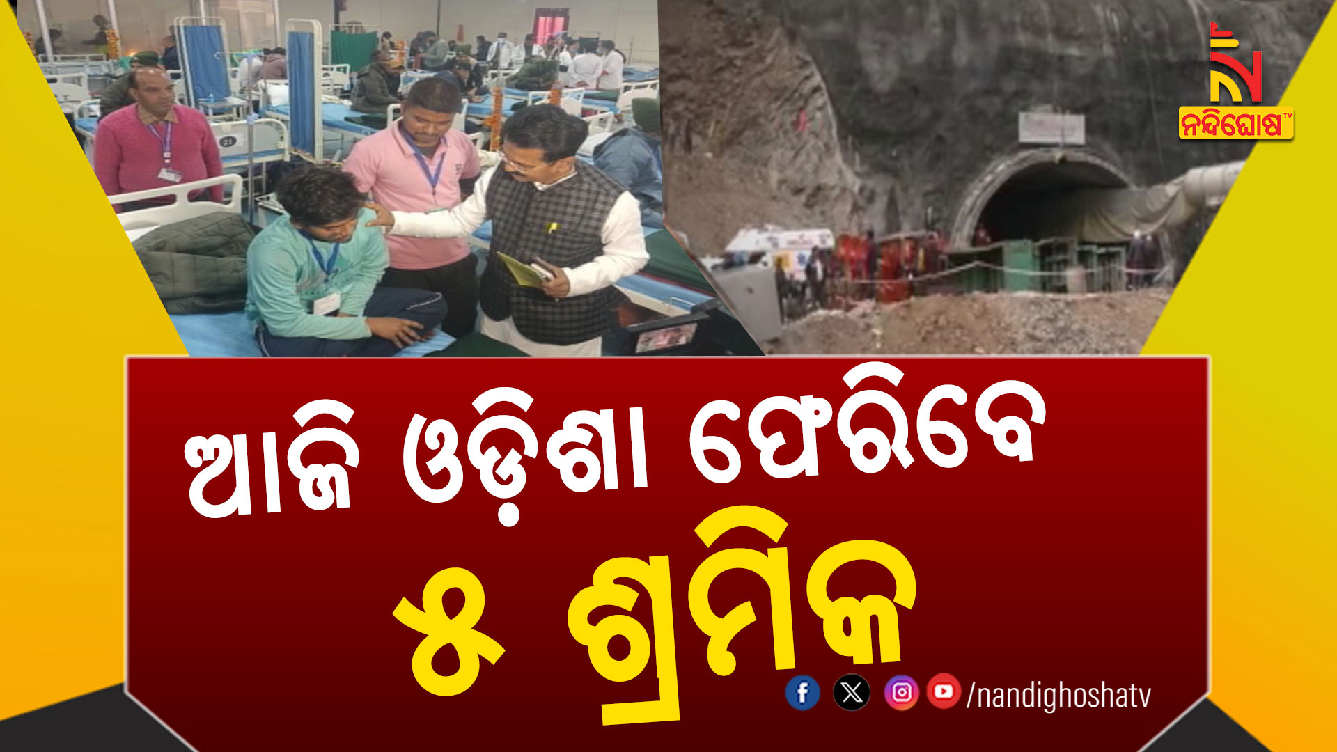 ଭୁବନେଶ୍ୱର : ଆଜି ଓଡ଼ିଶା ଫେରିବେ ଉତ୍ତରକାଶୀ ଟନେଲରୁ ଉଦ୍ଧାର ହୋଇଥିବା ୫ ଓଡ଼ିଆ ଶ୍ରମିକ। ଗତକାଲି ସମସ୍ତ ୫ ଓଡ଼ିଆ ଶ୍ରମିକ ଋଷିକେଶ ଏମ୍ସରୁ ଡିସଚାର୍ଜ ହେବା ପରେ ଦିଲ୍ଲୀ ଆସି ଓଡ଼ିଶା ଭବନରେ ରହିଥିଲେ। ଆଜି ଶ୍ରମିକ ଓ ସେମାନଙ୍କ ପରିବାର ସଦସ୍ୟଙ୍କୁ ଆଣି ଭୁବନେଶ୍ବର ଆସିବେ ଶ୍ରମମନ୍ତ୍ରୀ ସାରଦା ପ୍ରସାଦ ନାୟକ । ମୁଖ୍ୟମନ୍ତ୍ରୀ ନବୀନ ପଟ୍ଟନାୟକଙ୍କ ନିର୍ଦ୍ଦେଶକ୍ରମେ ଶ୍ରମମନ୍ତ୍ରୀ ସାରଦା ପ୍ରସାଦ ନାୟକଙ୍କ ସହ ଶ୍ରମ ବିଭାଗର ବରିଷ୍ଠ ଅଧିକାରୀ ଘଟଣାସ୍ଥଳରେ ରହି ଶ୍ରମିକଙ୍କୁ ସମସ୍ତ ସାହାଯ୍ୟ ସହଯୋଗ ଯୋଗାଇ ଦେଉଛନ୍ତି ।