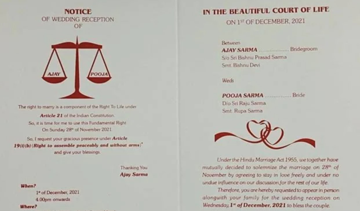 ଏହି ଯୋଡ଼ି ନିଜ ବିବାହ ପାଇଁ ସମ୍ୱିଧାନ ଥିମର କାର୍ଡ ବନେଇଛନ୍ତି । ଭାରତୀୟ ବିବାହର ନିୟମାବଳୀ ମଧ୍ୟ ଏହି କାର୍ଡରେ ଉଲ୍ଲେଖ ଥିବେ ଦେଖାଯାଉଛି । ଭାରତୀୟ ସମ୍ୱିଧାନ ଅନୁଚ୍ଛେଦ-୨୧ ଅନୁସାରେ ପ୍ରତ୍ୟେକ ବ୍ୟକ୍ତିଙ୍କ ଜୀବନର ‘ବିବାହ’ ଏକ ଅଧିକାର । ମୋର ଏହି ମୈାଳିକ ଅଧିକାରର ଉପଭୋଗ କରିବାକୁ ଆପଣମାନଙ୍କୁ ୨୮ ନଭେମ୍ବର ୨୦୨୧ରେ ଆମେ ଆମନ୍ତ୍ରଣ କରୁଛୁ ବୋଲି ଏଥିରେ ଲେଖାଯାଇଛି । ଏଥିରେ ଆହୁରି ମଧ୍ୟ ଲେଖା ଅଛି ଯେ ଯେତେବେଳେ ଜଣେ ଓକିଲ ବିବାହ କରିଥାଏ ସେତେବେଳେ ସେ ସମସ୍ତ ନିୟମ ଏବଂ ସର୍ତ୍ତକୁ ସ୍ୱିକାର କରିଥାଏ ।