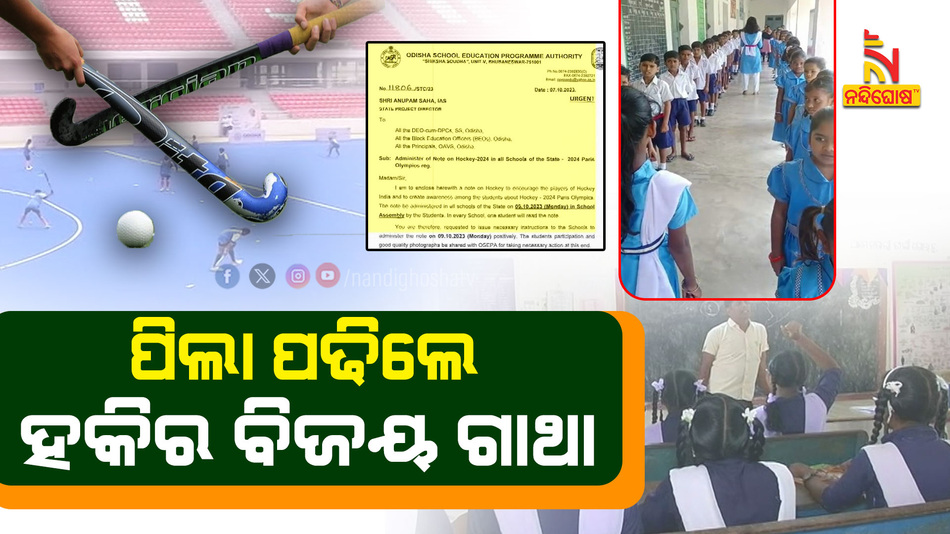 ଭୁବନେଶ୍ବର: ଆଜି ରାଜ୍ୟରେ ସବୁ ସ୍କୁଲରେ ପିଲାଙ୍କୁ ପଢ଼ାଯାଉଛି ହକିର ବିଜୟ ଗାଥା । ପ୍ରାର୍ଥନା ସଭାରେ ଭାରତୀୟ ହକିର ବିଜୟ ଗାଥା ପଢିଛନ୍ତି ଛାତ୍ରଛାତ୍ରୀ । ଏସିଆନ ଗେମ୍ସରେ ଭାରତୀୟ ହକି ଦଳ ସ୍ବର୍ଣ୍ଣ ଜିତି ଗୌରବ ଆଣିଛି । ଛାତ୍ରଛାତ୍ରୀଙ୍କୁ ହକିର ବିଜୟ ଗାଥା ସମ୍ପର୍କରେ ପଛାଇବାକୁ ସବୁ ଜିଲ୍ଲା ଶିକ୍ଷାଧିକାରୀଙ୍କୁ ଚିଠି ଲେଖିଥିଲା ଗଣଶିକ୍ଷା ବିଭାଗ ।