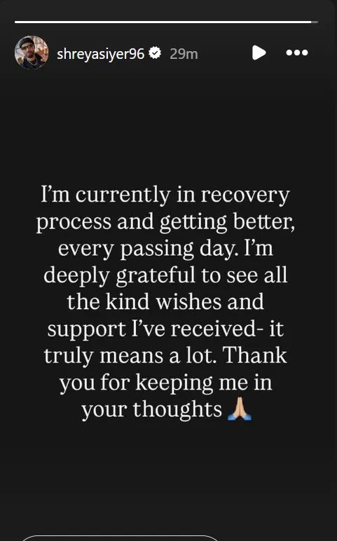 ଏବେ ଶ୍ରେୟସ ICUରୁ ବାହାରକୁ ଆସିଛନ୍ତି। ନିଜ ବର୍ତ୍ତମାନର ଅବସ୍ଥା ବିଷୟରେ ସେ ବ୍ୟକ୍ତିଗତ ସୂଚନା ଦେଇଛନ୍ତି। ଶ୍ରେୟସ ଆୟର ତାଙ୍କ ଇନଷ୍ଟାଗ୍ରାମ ଏକ ଷ୍ଟୋରୀରେ ଲେଖିଛନ୍ତି, “ମୁଁ ଏବେ ବି ସୁସ୍ଥ ହେଉଛି।” ଏହାର ଅର୍ଥ ହେଉଛି ସେ ସମ୍ପୂର୍ଣ୍ଣ ସୁସ୍ଥ ହୋଇନାହାଁନ୍ତି। ସେ ଆହୁରି କହିଛନ୍ତି ଯେ, ସେ ପ୍ରତିଦିନ ଭଲ ହେଉଛନ୍ତି। ତାଙ୍କ ସ୍ୱାସ୍ଥ୍ୟର ଆରୋଗ୍ୟ କାମନା ପାଇଁ ସମସ୍ତଙ୍କୁ ସେ ସମସ୍ତଙ୍କୁ ଧନ୍ୟବାଦ ମଧ୍ୟ ଦେଇଛନ୍ତି। ସେ କହିଛନ୍ତି, ” ଆପଣଙ୍କ ପ୍ରାର୍ଥନାରେ ପାଇଁ ସମସ୍ତଙ୍କୁ ଧନ୍ୟବାଦ।”