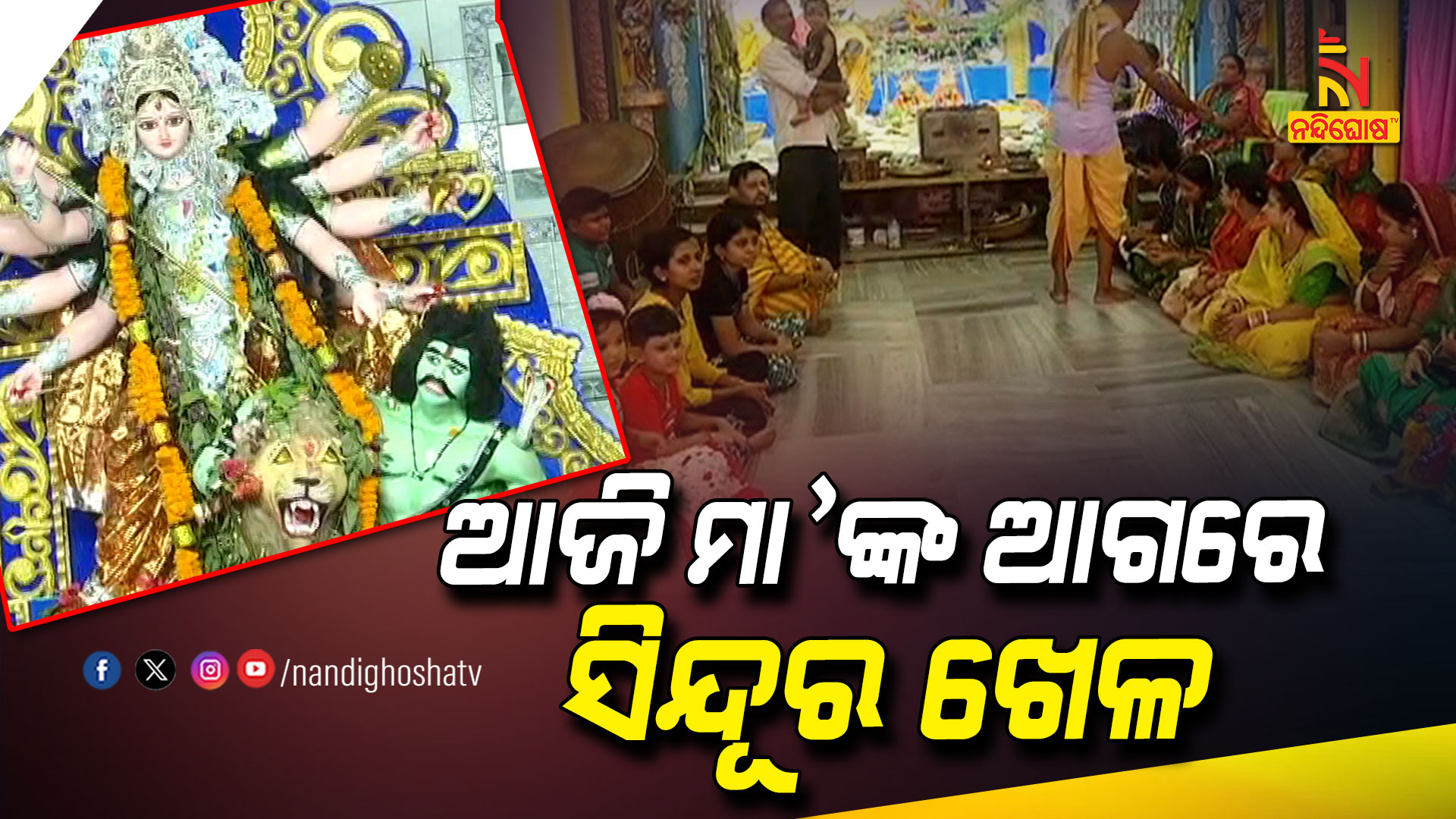 ଶାରଦୀୟ ଦୁର୍ଗାପୂଜାର ଆଜି ହେଉଛି ଶେଷ ପର୍ବ। ଆଉ କିଛି ସମୟ ପରେ ଧରାଧାମରୁ ବିଦାୟ ନେବେ ମା ଦଶଭୁଜା। ଏଥିପାଇଁ ସବୁଠି ବିଧି ଅନୁସାରେ କରାଯାଉଛି ମା’ଙ୍କୁ ଆବାହନ। ଯାଜପୁର ଜିଲ୍ଲା ବ୍ୟାସନଗର ସହରର ନହକା ପୂଜାମଣ୍ଡପରେ ସିନ୍ଦୁର ଖେଳ ମାଧ୍ୟମରେ ମାଙ୍କୁ ବିଦାୟ ଦେଉଛନ୍ତି ସାଧବା ନାରୀ ମାନେ ।