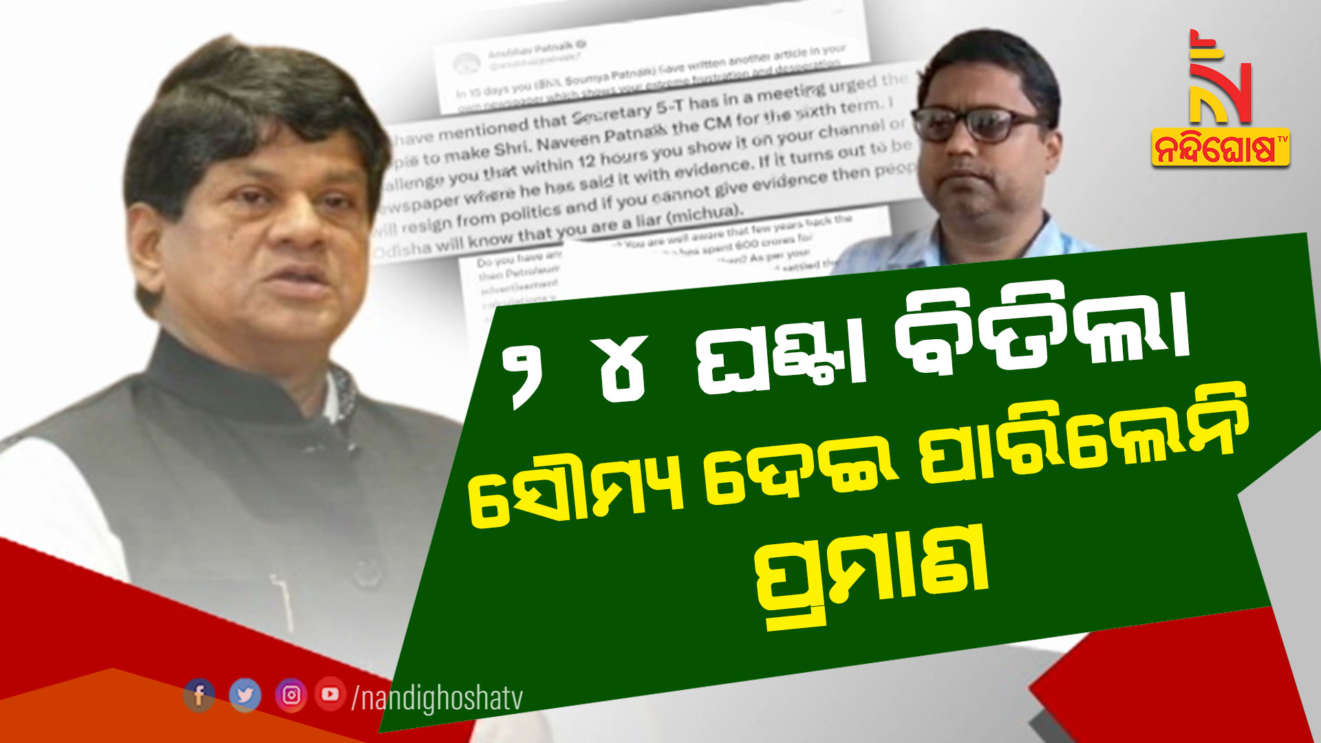 ଭୁବନେଶ୍ବର: ୧୨ ଘଣ୍ଟା ଯାଇ ୨୪ ଘଣ୍ଟା ବିତିଲା । ପ୍ରମାଣ ଦେଇପାରିଲେନି ସୌମ୍ୟରଞ୍ଜନ ପଟ୍ଟନାୟକ । ଅନୁଭବ ପଟ୍ଟନାୟକ ଦେଇଥିଲେ ଚ୍ୟାଲେଞ୍ଜ । କହିଥିଲେ- ଆଲେଖ୍ୟରେ କରିଥିବା ଅଭିଯୋଗ ପ୍ରମାଣ କରିନପାରିଲେ ରାଜ୍ୟବାସୀଙ୍କ ଆଗରେ ମିଛୁଆ ହେବେ ସୌମ୍ୟ ।