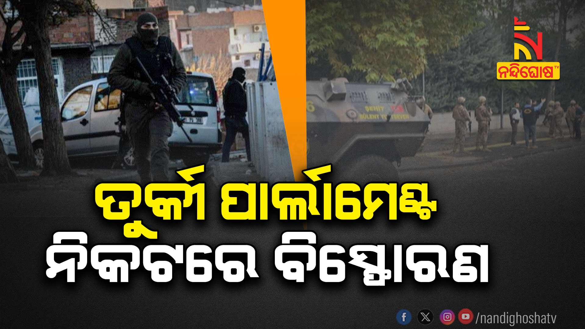 ଆଙ୍କାରା: ତୁର୍କୀର ଆଙ୍କାରା ସ୍ଥିତ ସଂସଦ ଭବନ ନିକଟରେ ବଡ଼ ଧରଣର ବିସ୍ଫୋରଣ । ବିସ୍ଫୋରଣରେ ନିଜକୁ ଉଡାଇ ଦେଲା ଜଣେ ଆତ୍ମଘାତୀ । ବିସ୍ଫୋରଣ ପରେ ସୁରକ୍ଷା କର୍ମୀ ଓ ଆତ୍ମଘାତୀଙ୍କ ମଧ୍ୟରେ ଗୁଳି ବିନିମୟ । ସୁରକ୍ଷାକର୍ମୀଙ୍କୁ ଗୁଳିରେ ଜଣେ ଆତ୍ମଘାତୀ ମୃତ ।