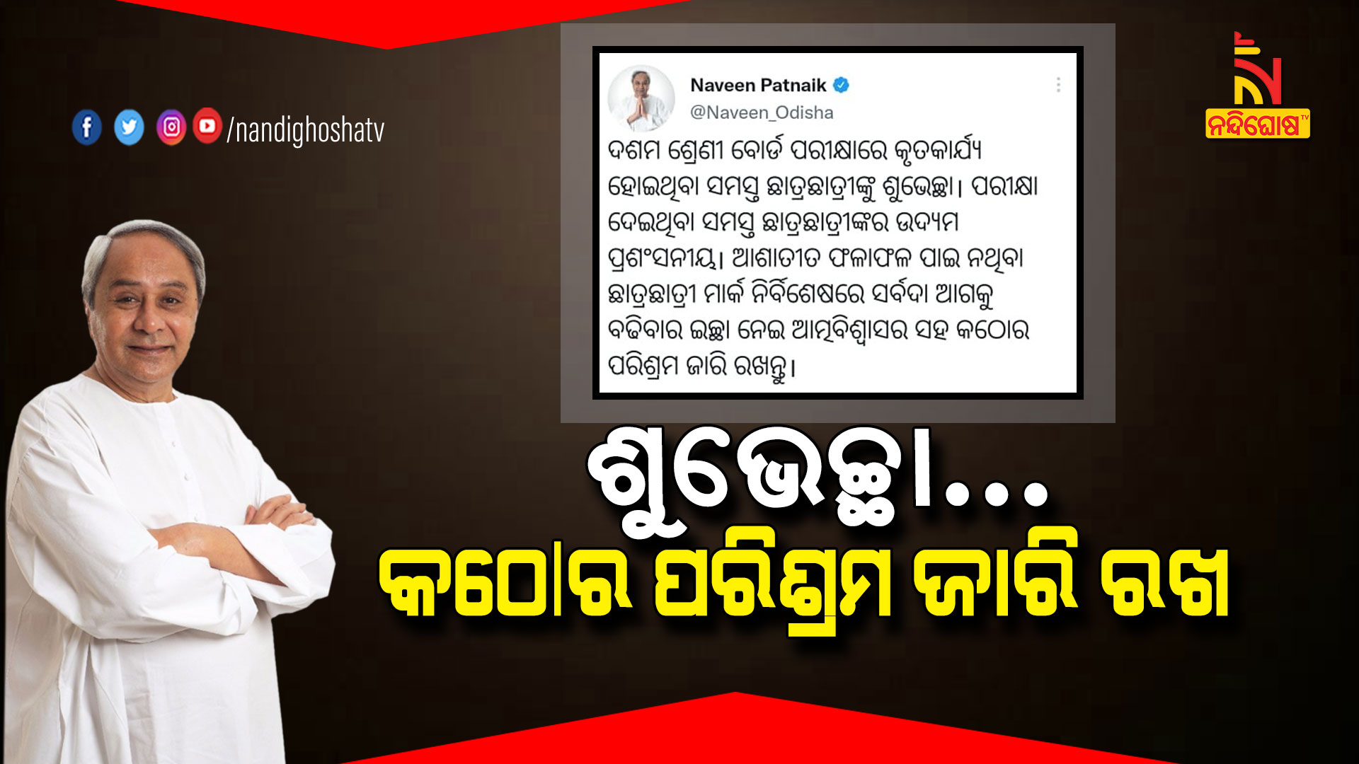 ମାଟ୍ରିକ୍ ରେଜଲ୍ଟ ପ୍ରକାଶ ପାଇବା ପରେ ଛାତ୍ରଛାତ୍ରୀଙ୍କୁ ଶୁଭେଚ୍ଛା ଜଣାଇଛନ୍ତି ମୁଖ୍ୟମନ୍ତ୍ରୀ ନବୀନ ପଟ୍ଟନାୟକ । ଦଶମ ଶ୍ରେଣୀ ବୋର୍ଡ ପରୀକ୍ଷାରେ କୃତକାର୍ଯ୍ୟ ହୋଇଥିବା ସମସ୍ତ ଛାତ୍ରଛାତ୍ରୀଙ୍କୁ ଶୁଭେଚ୍ଛା । ପରୀକ୍ଷା ଦେଇଥିବା ସମସ୍ତ ଛାତ୍ରଛାତ୍ରୀଙ୍କର ଉଦ୍ୟମ ପ୍ରଶଂସନୀୟ । ଆଶାତୀତ ଫଳାଫଳ ପାଇନଥିବା ଛାତ୍ରଛାତ୍ରୀ ମାର୍କ ନିର୍ବିଶେଷରେ ସର୍ବଦା ଆଗକୁ ବଢ଼ିବାର ଇଚ୍ଛା ନେଇ ଆତ୍ମବିଶ୍ୱାସର ସହ କଠୋର ପରିଶ୍ରମ ଜାରି ରଖନ୍ତୁ ବୋଲି ଟ୍ୱିଟ୍ କରି କହିଛନ୍ତି ମୁଖ୍ୟମନ୍ତ୍ରୀ ନବୀନ ପଟ୍ଟନାୟକ ।