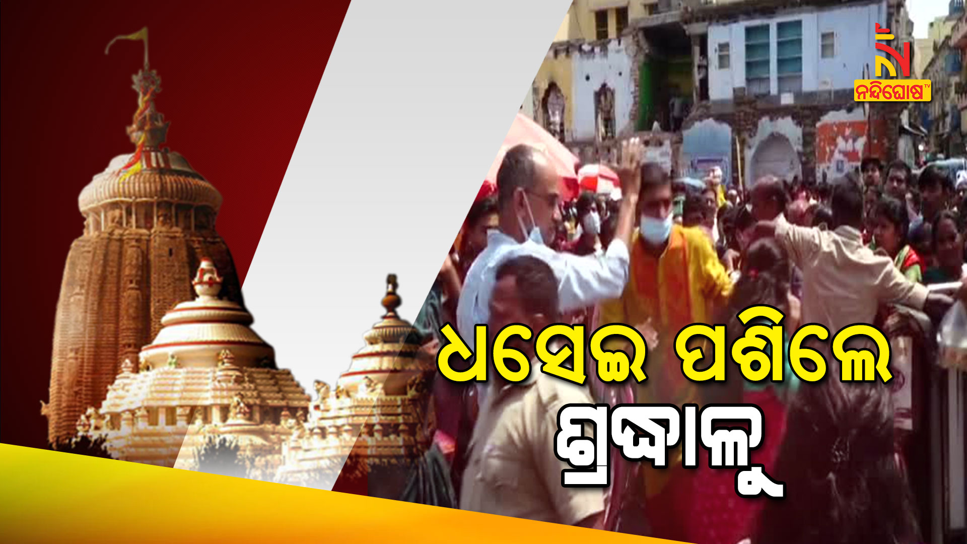ପୁରୀ: ଆଜି ଦୋଳ ଉତ୍ସବ ଓ ସୁନାବେଶ ପାଇଁ ଶ୍ରୀକ୍ଷେତ୍ରରେ ପ୍ରବଳ ଭିଡ଼ ହୋଇଛି । ଭିଡ଼ ଏତେ ହୋଇଥିଲା ଯେ ଭକ୍ତମାନେ ଶ୍ରୀମନ୍ଦିର ମଧ୍ୟକୁ ଧସେଇ ପଶିଥିଲେ । ସିଂହଦ୍ୱାର ସମ୍ମୁଖ ବାରିକେଡ ଭାଙ୍ଗି ଧସେଇ ପଶିଲେ ଶ୍ରଦ୍ଧାଳୁ । ପ୍ରବଳ ଖରା ଓ ଭକ୍ତଙ୍କ ଭିଡ ଥିବାରୁ ଏଭଳି ଅଭାବନୀୟ ପରିସ୍ଥିତି ସୃଷ୍ଟି ହୋଇଥିଲା । ଲମ୍ବା ଧାଡ଼ି ଲାଗି ରହିଥିବାରୁ ଧୌର୍ଯ୍ୟ ହରାଇଲେ ଭକ୍ତ । ଶ୍ରୀଜିଉଙ୍କ ରାଜରାଜେଶ୍ୱର ବେଶ ଦର୍ଶନ ପାଇଁ ଭକ୍ତ ବଡ଼ଦେଉଳକୁ ଧସେଇ ପଶିଥିବା ଦେଖିବାକୁ ମିଲିଛି ।