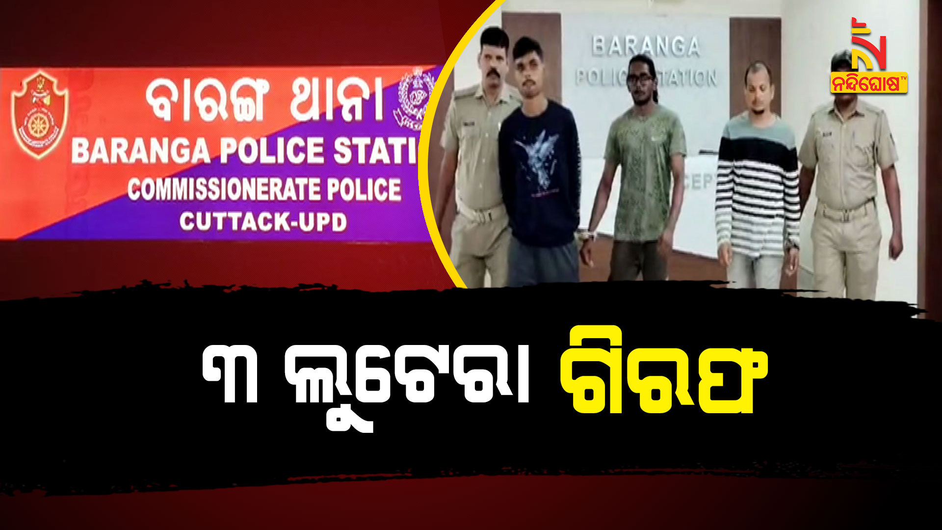 ବାରଙ୍ଗ: ବାରଙ୍ଗ ଥାନା ଅଞ୍ଚଳର ବିଭିନ୍ନ ସ୍ଥାନରୁ ଲୁଟ କରୁଥିବା ତିନିଜଣ ଲୁଟେରା ଗିରଫ। ଗତ କିଛି ଦିନ ତଳେ ପୁରୀ କେନାଲ ରୋଡ଼ରେ ସାନମୁଣ୍ଡଳୀ ଗାଁର ବିଶ୍ୱଜିତ ବେହେରା ଘରକୁ ଫେରୁଥିବା ବେଳେ ତିନିଜଣ ଲୁଟେରା ଗାଡ଼ି ଅଟକାଇ ତାଙ୍କ ଠାରୁ ୫୦୦ ଟଙ୍କା ଓ ବାଇକ ନେଇଯାଇଥିଲେ।