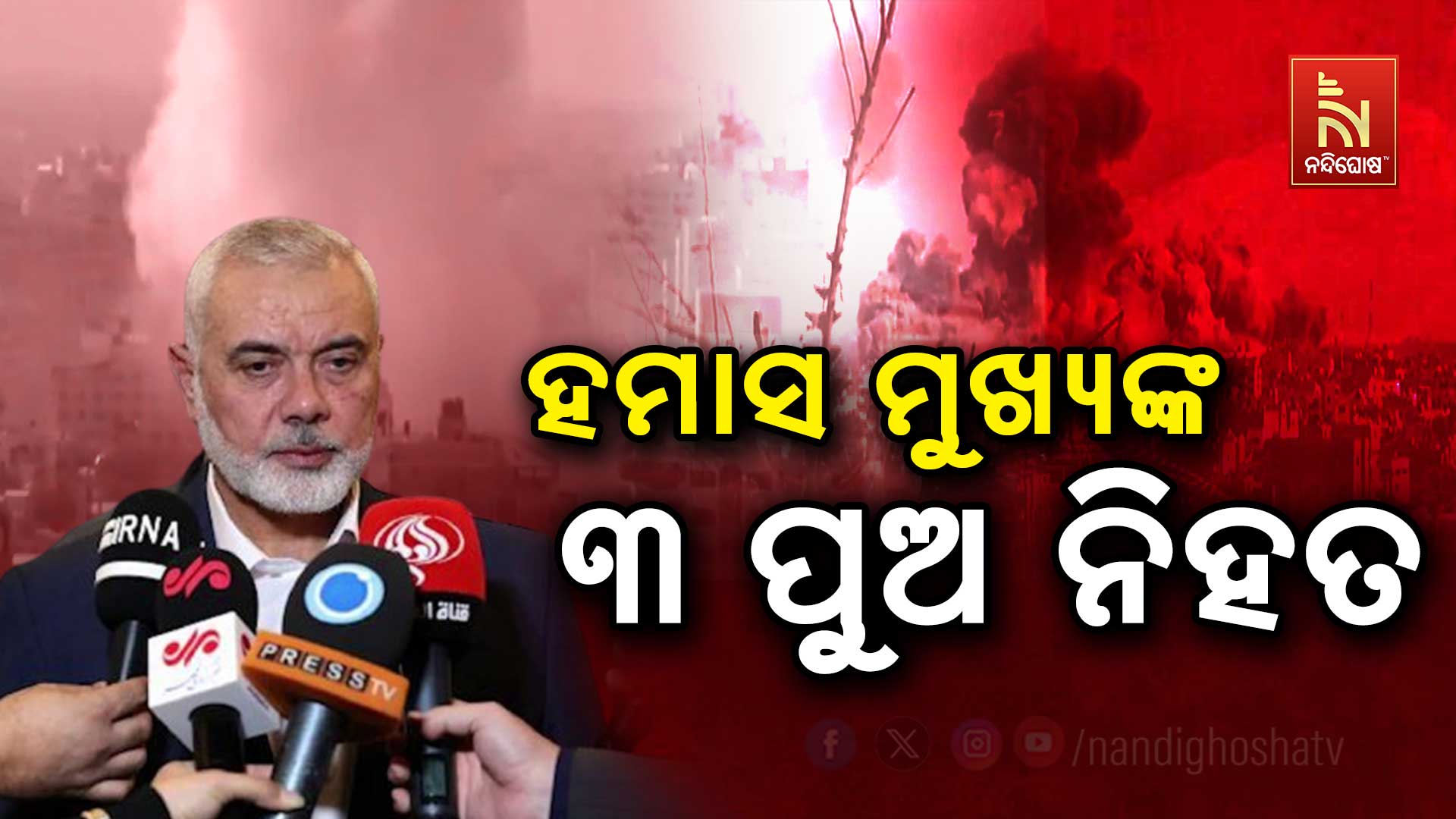 ଜେରୁଜେଲମ: ଇସ୍ରାଏଲ-ହମାସ ମଧ୍ୟରେ ପୁଣି ସଂଘର୍ଷ ତେଜିଲା। ଆକ୍ରମଣରେ ଆତଙ୍କୀ ସଂଗଠନ ହମାସ ମୁଖ୍ୟ ଇସମାଇଲ୍ ହାନିୟେଙ୍କ ୩ ପୁଅଙ୍କ ମୃତ୍ଯୁ ଘଟିଛି। ଇସ୍ରାଏଲ ସେନା ଆକ୍ରମଣରେ ନିହତ ହୋଇନ୍ତି ହମାସ ମୁଖ୍ୟ ହାନିୟେଙ୍କ ୩ ପୁଅ। ଜେରୁଜେଲମର ଅଲ ଆକସା ମସଜିଦ ଯିବା ବାଟରେ ତାଙ୍କ କାର ଉପରେ ଏୟାର ଷ୍ଟ୍ରାଇକ କରିଥିଲା ଇସ୍ରାଏଲ ସେନା। ଏଥିରେ ହାନିୟେଙ୍କ ୩ ପୁଅ ହାଜେମ, ଆମିର ଏବଂ ମହମ୍ମଦଙ୍କ ମୃତ୍ଯୁ ଘଟିଛି। ଏହାସହ ହାନିୟେଙ୍କ ୨ ନାତିଙ୍କର ମଧ୍ୟ ମୃତ୍ଯୁ ହୋଇଛି। ଅନ୍ୟ ଜଣେ ନାତି ଗୁରୁତର ହୋଇ ମେଡିକାଲରେ ଭର୍ତ୍ତି ହୋଇଛନ୍ତି। ହମାସ ଗଣମାଧ୍ୟମ ପକ୍ଷରୁ ଏହି ସୂଚନା ଦିଆଯାଇଛି।