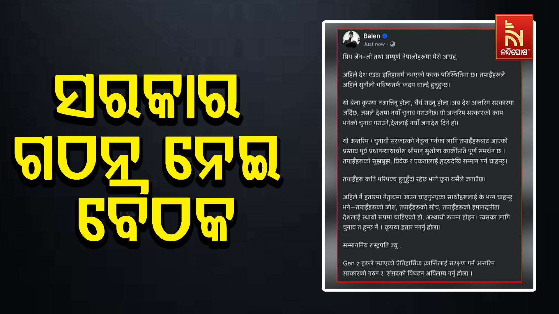ନେପାଳରେ ସରକାର ଗଠନ ନେଇ ଆଜି ବସିବ ବୈଠକ। ନେପାଳ ସେନା ପକ୍ଷରୁ ଡକାଯାଇଛି ଏହି ବୈଠକ। ସେନା ମୁଖ୍ୟାଳୟରେ ବୈଠକ ଡାକିଛନ୍ତି ନେପାଳ ସେନାମୁକ୍ୟ। ଜେନ ଜେଡ୍ ପ୍ରତିନିଧିଙ୍କୁ ଏହି ବୈଠକକୁ ଆଲୋନଚା ଲାଗି ଡକାଯାଇଛି। ନେପାଳରେ ହିଂସାକାଣ୍ଡ ଲାଗି ରହିଥିବାବେଳେ ପରବର୍ତ୍ତୀ ସରକାର ଗଠନ ନେଇ ବସିବ ବୈଠକ। ସେପଟେ ପ୍ରଥମେ ସରକାର ଭଂଗ ପରେ ସରକାର ଗଠନ କରିବାକୁ ଦାବି କରିଛନ୍ତି ଜେନ ଜେଡ୍ ଆନ୍ଦୋଳନକାରୀ।