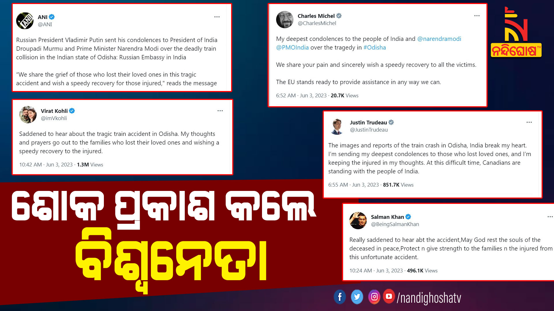 ବାଲେଶ୍ୱର: ବାଲେଶ୍ବର ବାହାନଗାରେ ଘଟିଥିବା ଟ୍ରେନ୍ ଦୁର୍ଘଟଣାକୁ ନେଇ ବିଭିନ୍ନ ମହଲରେ ଶୋକ । ବିଶ୍ବନେତାଙ୍କ ଠାରୁ ଆରମ୍ଭ କରି କ୍ରୀଡାବିତ ଓ ଅଭିନେତା ଶୋକ ପ୍ରକାଶ କରିଛନ୍ତି । ଦୁର୍ଘଟଣାକୁ ନେଇ ଶୋକବ୍ୟକ୍ତ କରିଛନ୍ତି ଋଷ ରାଷ୍ଟ୍ରପତି ଭ୍ଲାଦିମିର ପୁଟିନ । ସେ ନିଜ ସମବେଦନା ନେଇ ଭାରତ ରାଷ୍ଟ୍ରପତି ଦ୍ରୌପଦୀ ମୁର୍ମୁ ଓ ପ୍ରଧାନମନ୍ତ୍ରୀ ନରେନ୍ଦ୍ର ମୋଦୀଙ୍କୁ ଅବଗତ କରାଇଛନ୍ତି । ୟୁରୋପିଆନ ୟୁନିଅନ ଅଧ୍ୟକ୍ଷ ଚାର୍ଲସ ମିସେଲ । କାନାଡା ପ୍ରଧାନମନ୍ତ୍ରୀ ଜଷ୍ଟିନ ଟ୍ରୁଡୁ, ତାଇଓ୍ବାନ ରାଷ୍ଟ୍ରପତି ସାଇ ଇଙ୍ଗ ଓ୍ବେନ୍ ପ୍ରମୁଖ ଶୋକ ବ୍ୟକ୍ତ କରିଛନ୍ତି ।
