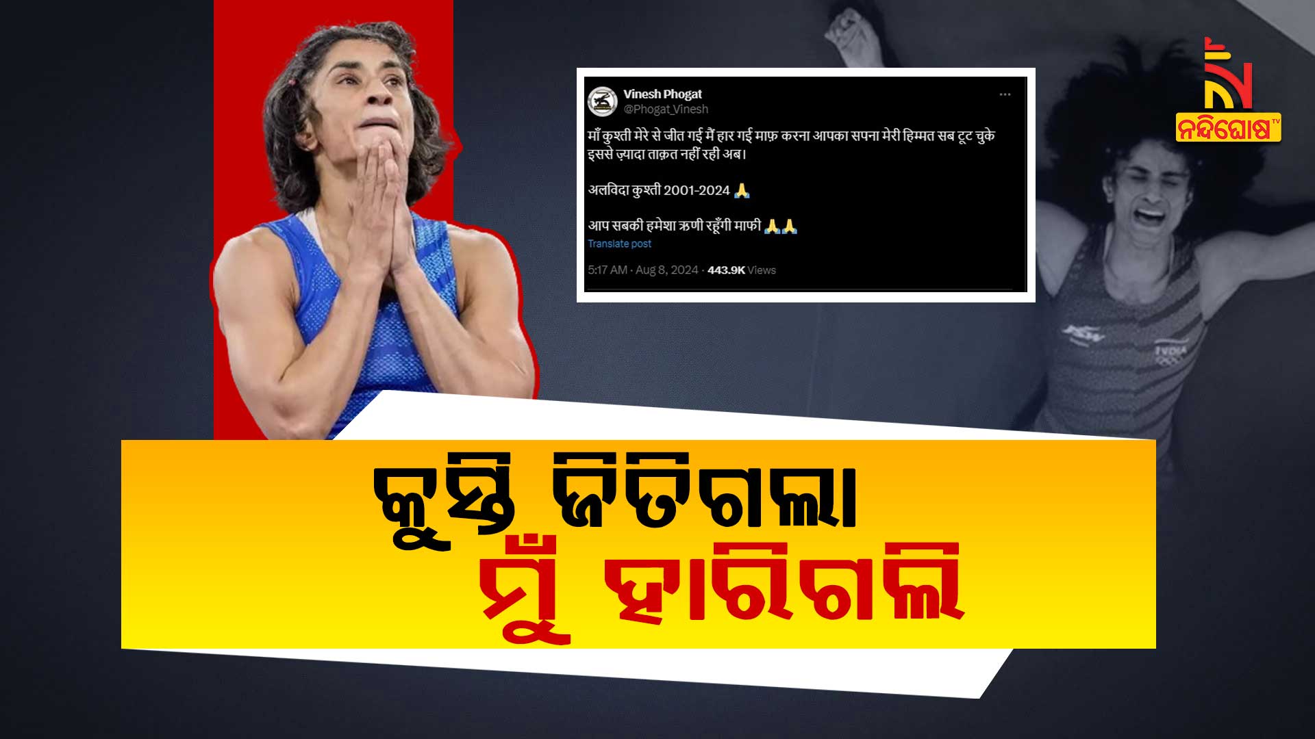 ଗତକାଲି ମହିଳା ୫୦ ବର୍ଗରେ କୁସ୍ତିରେ ମାତ୍ର ଶହେ ଗ୍ରାମ ଓଜନ ବୃଦ୍ଧି ପାଇଁ ଭିନେଶଙ୍କୁ ଅଯୋଗ୍ଯ ଘୋଷଣା କରାଯାଇଥିଲା । ସେ ସେମିଫାଇନାଲ ରାଉଣ୍ଡ ଜିତି ଫାଇନାଲକୁ ଯାଇଥିଲେ । ସେମିଫାଇନାଲରେ କ୍ୟୁବାର ପ୍ରତିଯୋଗୀଙ୍କୁ ଭିନେଶ ୫-୦ ପଏଣ୍ଟରେ ହରାଇଥିଲେ। ରାତିରେ ଫାଇନାଲ ମୁକାବିଲା ଥିଲା । ହେଲେ ତାର କିଛି ଘଣ୍ଟା ପୂର୍ବରୁ ତାଙ୍କୁ ଅଲିମ୍ପିକ୍ସ କମିଟି ଅଯୋଗ୍ଯ ଘୋଷଣା କରି ସାରାଦେଶକୁ ସ୍ତବ୍ଧ କରିଦେଇଛି । ଆଜି ଜିତିଥିଲେ ଭିନେଶ ସ୍ବର୍ଣ୍ଣ ଏବଂ ପରାସ୍ତ ହୋଇଥିଲେ ରୋପ୍ଯ ପଦକ ଜିତିଥାନ୍ତେ । ହେଲେ ଦେଶ ତଥା ଭିନେଶଙ୍କ ସ୍ବପ୍ନ ଧୂଳିସାତ ହୋଇଯାଇଛି । ସେପଟେ ପରିବାର ଲୋକ ଅଭିଯୋଗ କରିଛନ୍ତି ଯେ, ଏହା ପଛରେ ବହୁତ ବଡ଼ ଷଡ଼ଯନ୍ତ୍ର କରାଯାଇଛି ।