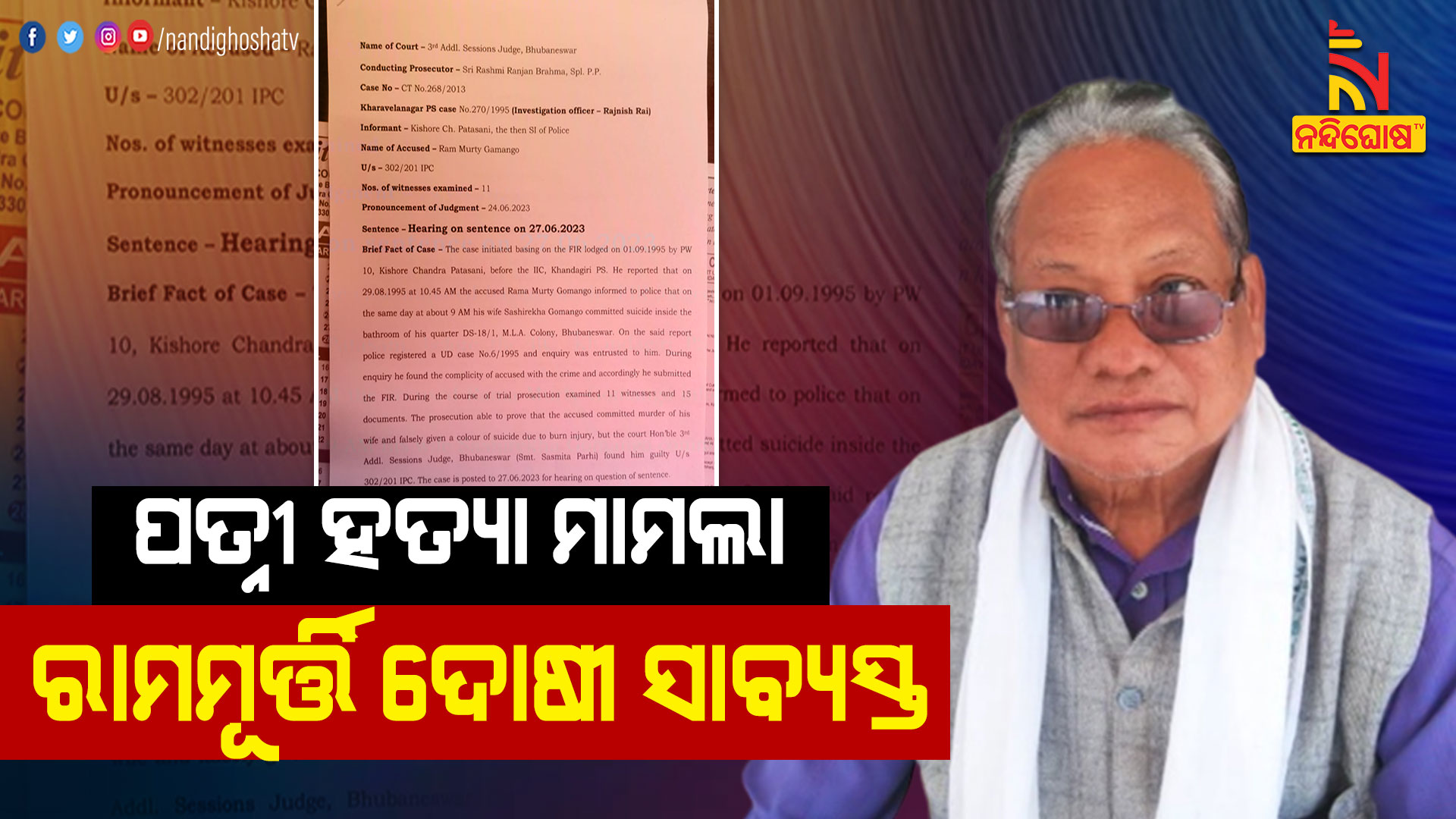 ଭୁବନେଶ୍ୱର: ୧୯୯୫ର ବହୁଚର୍ଚ୍ଚିତ ବିଧାୟକଙ୍କ ପତ୍ନୀଙ୍କୁ ହତ୍ୟା ମାମଲା । ଦୋଷୀ ସାବ୍ୟସ୍ତ ହେଲେ ସ୍ବାମୀ ତଥା ପୂର୍ବତନ ବିଧାୟକ ରାମମୂର୍ତ୍ତି ଗମାଙ୍ଗୋ । ଭୁବନେଶ୍ବର ବିଧାୟକ କ୍ବାର୍ଟର୍ସରେ ପତ୍ନୀ ଶଶୀରେଖା ଗମାଙ୍ଗୋଙ୍କୁ ପୋଡ଼ି ମାରିଥିଲେ ଗୁଣୁପୁରର ପୂର୍ବତନ ବିଧାୟକ ରାମମୂର୍ତ୍ତି ଗମାଙ୍ଗୋ । ୨୮ ବର୍ଷ ପରେ ରାମମୂର୍ତ୍ତିଙ୍କୁ ଦୋଷୀ ସାବ୍ୟସ୍ତ କରିଛନ୍ତି ଭୁବନେଶ୍ବର ଏଡିଜେ-୩ କୋର୍ଟ । ୧୧ ଜଣ ସାକ୍ଷୀ ଓ ଗୁରୁତ୍ବପୂର୍ଣ୍ଣ ପ୍ରମାଣ ଆଧାରରେ ପତ୍ନୀହତ୍ୟା ମାମଲାରେ ପୂର୍ବତନ ବିଧାୟକ ଦୋଷୀ ସାବ୍ୟସ୍ତ ହୋଇଛନ୍ତି । ୧୯୯୫ ମସିହାରେ ଭୁବନେଶ୍ବର ବିଧାୟକ କ୍ବାର୍ଟର୍ସରେ ପତ୍ନୀଙ୍କୁ ପୋଡ଼ି ମାରିଦେଇଥିଲେ ରାମମୂର୍ତ୍ତି ।