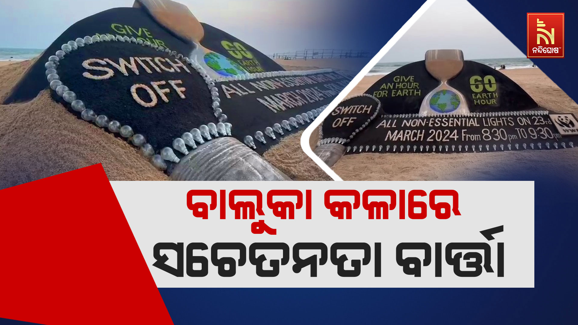 ପୁରୀ : ଆଜି ବିଶ୍ୱ ଆର୍ଥ ଆଓ୍ବାର ଦିବସ। ପ୍ରତିବର୍ଷ ମାର୍ଚ୍ଚ ୨୩ ତାରିଖ ଦିନ ଏହି ଦିବସ ଟିକୁ ବିଶ୍ଵବ୍ୟାପୀ ପାଳନ କରାଯାଇଥାଏ। ଏହି ଦିନ ପ୍ରତ୍ୟେକ ଘରେ ଘରେ ରାତି ୮ଟା୩୦ ରୁ ୯ଟା୩୦ ପର୍ଯ୍ୟନ୍ତ ପ୍ରାୟ ଏକ ଘଣ୍ଟା ପାଇଁ ଶକ୍ତି ସଞ୍ଚୟ ଉଦ୍ଦେଶ୍ୟରେ ବିଦ୍ୟୁତ କାଟ କରାଯାଏ। ଏହି ମହତ୍ କାର୍ଯ୍ୟକୁ ନେଇ ଜନସଚେତନତା ବାର୍ତ୍ତା ପ୍ରଦାନ ଉଦ୍ଦେଶ୍ୟରେ ପୁରୀ ବେଳା ଭୂମିରେ ନିର୍ମାଣ ହୋଇଛି ବାଲୁକା କଳା।