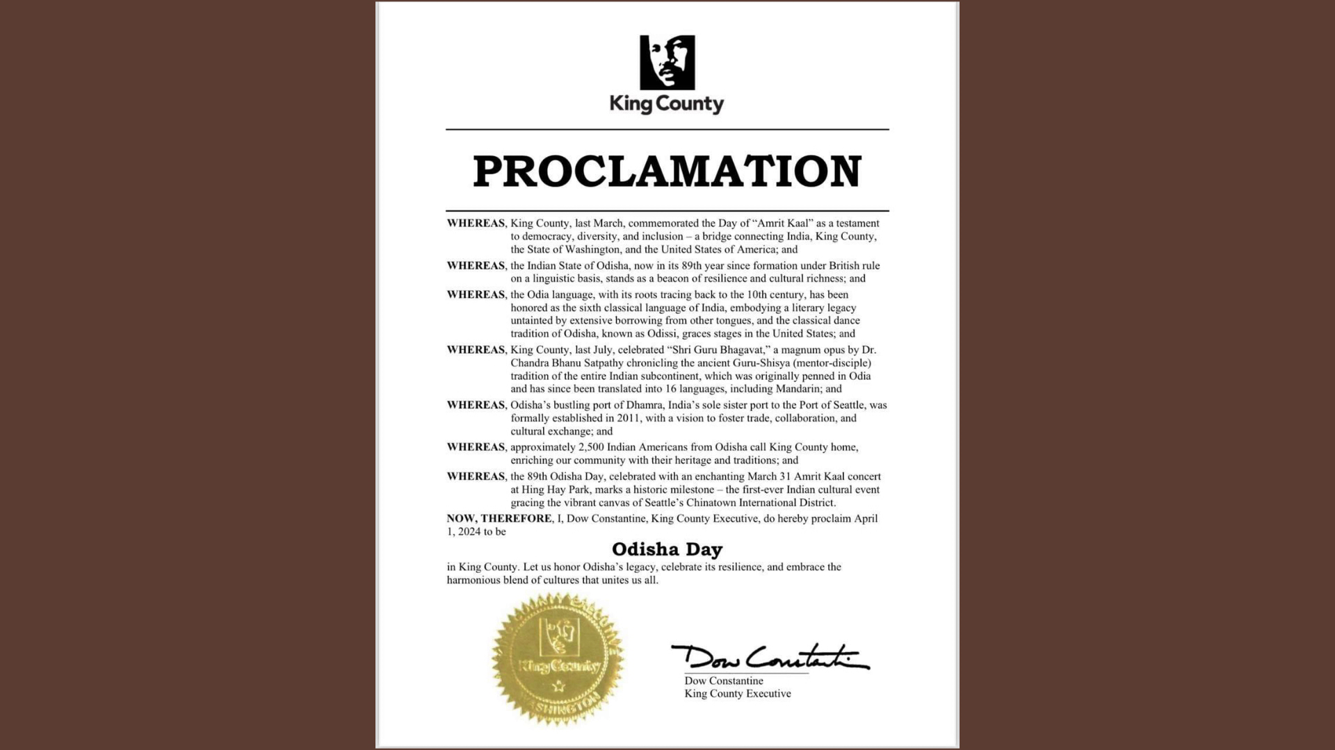 ନନ୍ଦିଘୋଷ ବ୍ୟୁରୋ: ଆମେରିକାରେ ପାଳନ ହେବ ଓଡ଼ିଶା ଦିବସ। ଏପ୍ରିଲ ପହିଲାକୁ ଓଡ଼ିଶା ଦିବସ ଭାବେ ପାଳନ ଲାଗି ସରକାରୀ ଘୋଷଣାପତ୍ର ଜାରି କରାଯାଇଛି। ଆମେରିକାରେ କିଙ୍ଗ୍ କାଉଣ୍ଟି ପକ୍ଷରୁ ଏପ୍ରିଲ ପହିଲାକୁ ଓଡ଼ିଶା ଦିବସ ଭାବେ ପାଳନ କରିବାକୁ ସରକାରୀ ଘୋଷଣାପତ୍ର ଜାରି କରାଯାଇଛି। କିଙ୍ଗ କାଉଣ୍ଟିର ଏକଜିକ୍ଯୁଟିଭ ଡୋ କନଷ୍ଟାଇନ୍ ଏକ ଘୋଷଣାପତ୍ରରେ ଓଡ଼ିଶାର ଉତ୍କର୍ଷ କଳା, ଓଡି଼ଆ ଭାଷା ଓ ସଂସ୍କୃତିର ପ୍ରଚାର ଓ ପ୍ରସାର ମାଧ୍ଯମରେ ଦୁଇ ପ୍ରଦେଶ ମଧ୍ୟରେ ସଂହତି ସ୍ଥାପନରେ ଏହା ଅଧିକ ସହାୟକ ହେବ ବୋଲି ଉଲ୍ଲେଖ କରିଛନ୍ତି। ଆମେରିକାର ବେଲଭ୍ଯୁ ଓ ସିଆଟେଲ ସହରରେ ଅଢେଇ ହଜାରରୁ ଅଧିକ ଓଡ଼ିଆ ଭାଷାଭାଷୀ ବସବାସ କରୁଛନ୍ତି। ଗୁରୁଜୀ ଡକ୍ଟର ଚନ୍ଦ୍ରଭାନୁ ଶତପଥୀଙ୍କ ପ୍ରେରଣା ଓ ମାର୍ଗଦର୍ଶନରେ ସେମାନେ ଏକତ୍ରିତ ହୋଇ ଓଡ଼ିଆ ଭାଷା ଓ ସଂସ୍କୃତିର ପ୍ରଚାର ପ୍ରସାର ନିମିତ୍ତ ବଳିଷ୍ଠ ଭୂମିକା ଗ୍ରହଣ କରି ଆସୁଛନ୍ତି। ଗତବର୍ଷ ଜୁଲାଇ ମାସରେ କିଙ୍ଗ କାଉଣ୍ଟି ପକ୍ଷରୁ ସରକାରୀ ଭାବେ ଶ୍ରୀଗୁରୁ ଭାଗବତ ଦିବସ ପାଳନ କରାଯାଇଥିଲା। ଆମେରିକାରେ ସରକାରୀ ସ୍ତରରେ ଓଡ଼ିଆ ଭାଷା, ସଂସ୍କୃତିର ଏପରି ଆଦର ଓ ସ୍ଵୀକୃତିକୁ ପ୍ରବାସୀ ଓଡ଼ିଆମାନେ ଉଚ୍ଚ ପ୍ରସଂସା କରି କିଙ୍ଗ କାଉଣ୍ଟି କର୍ତ୍ତୃପକ୍ଷଙ୍କୁ ଧନ୍ୟବାଦ ଜଣାଇବା ସହ ଗୁରୁଜୀ ଡକ୍ଟର ଚନ୍ଦ୍ରଭାନୁ ଶତପଥୀଙ୍କୁ କୃତଜ୍ଞତା ଜଣାଇଛନ୍ତି।