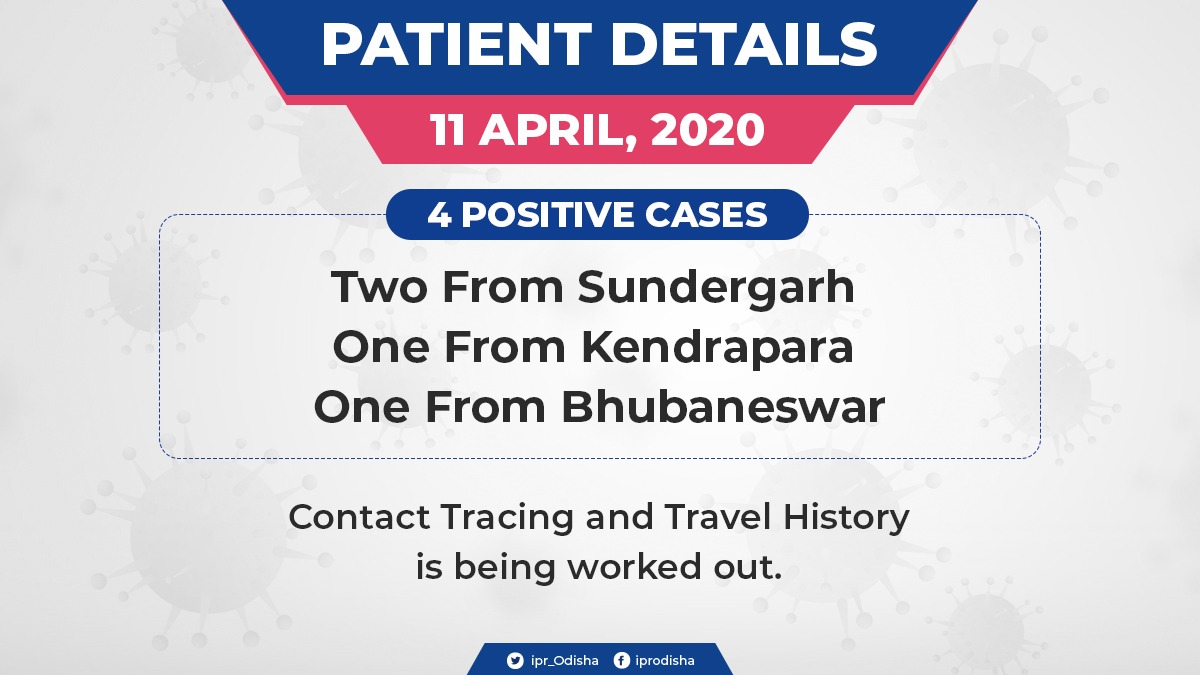 ଭୁବନେଶ୍ୱର: ଗତକାଲି ଚିହ୍ନଟ ୪ କରୋନା ପଜିଟିଭ୍ ମଧ୍ୟରୁ ୨ ଜଣ ସୁନ୍ଦରଗଡ଼ର, ଜଣେ କେନ୍ଦ୍ରାପଡ଼ାର ଓ ଅନ୍ୟ ଜଣେ ଭୁବନେଶ୍ୱରର । ଆକ୍ରାନ୍ତଙ୍କ କଣ୍ଟାକ୍ଟ ଟ୍ରେସିଂ ଓ ଟ୍ରାଭେଲ ହିଷ୍ଟ୍ରୀ ସଂଗ୍ରହ ଚାଲିଛି ।