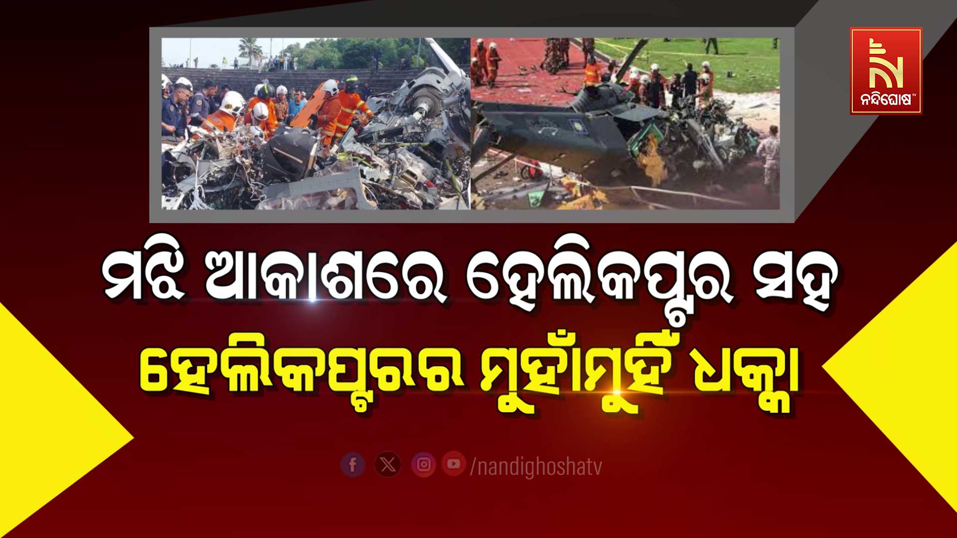 କ୍ବାଲାଲାମପୁର: ମଝି ଆକାଶରେ ଧକ୍କା ହେଲା ୨ ନୌସେନା ହେଲିକପ୍ଟର। ମାଲେସିଆ ନୌସେନାର ୨ଟି ହେଲିକପ୍ଟର ମଝି ଆକାଶରେ ଦୁର୍ଘଟଣାଗ୍ରସ୍ତ ହୋଇଛି। ୨ଟି ଯାକ ହେଲିକପ୍ଟର ପରସ୍ପର ସହ ଧକ୍କା ହେବା ଫଳରେ ୧୦ ଜଣଙ୍କ ମୃତ୍ୟୁ ଘଟିଛି। ରୟାଲ ମାଲେସିଆନ୍ ନାଭାଲ ପରେଡ୍ ପାଇଁ ଲୁମୁଟ୍ ନୌସେନା ଘାଟିରେ ସାମରିକ ଅଭ୍ୟାସ ଚାଲିଥିବାବେଳେ ମଙ୍ଗଳବାର ସକାଳ ପ୍ରାୟ ୯ଟା ୩୨ରେ ଏହି ଦୁର୍ଘଟଣା ଘଟିଛି।