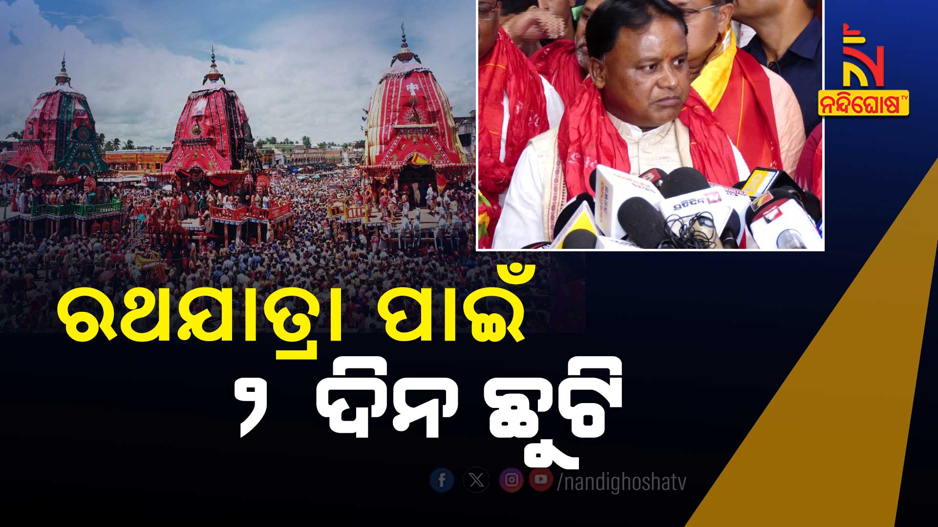 ପୁରୀ : ଚଳିତ ବର୍ଷ ବିଶ୍ୱପ୍ରସିଦ୍ଧ ରଥଯାତ୍ରା ପାଇଁ ୨ ଦିନ ଛୁଟି ଘୋଷଣା । ପୁରୀ ସମୀକ୍ଷା ବୈଠକରେ ଏ ନେଇ ଘୋଷଣା କରିଛନ୍ତି ମୁଖ୍ୟମନ୍ତ୍ରୀ ମୋହନ ମାଝୀ । ୨ ଦିନ ଛୁଟି ନେଇ ବିଧିବଦ୍ଧ ଭାବେ ବିଜ୍ଞପ୍ତି ପ୍ରକାଶ କରିବାକୁ ଅଧିକାରୀ ମାନଙ୍କୁ ନିର୍ଦ୍ଦେଶ ଦେଇଛନ୍ତି ମୁଖ୍ୟମନ୍ତ୍ରୀ । ଚଳିତବର୍ଷ ୨ ଦିନ ଧରି ରଥଯାତ୍ରା ଅନୁଷ୍ଠିତ ହେଉଥିବାରୁ ଜୁଲାଇ ୭ ଏବଂ ୮ ତାରିଖକୁ ସରକାରୀ ଛୁଟି ଘୋଷଣା କରାଯାଇଛି ।