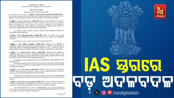 ଏସିଏସ ଅରବିନ୍ଦ ପାଢ଼ୀ ହୋଇଛନ୍ତି ରାଜସ୍ୱ ବିଭାଗ ସଚିବ । ସୁରେଶ ବଶିଷ୍ଠ ଭିନ୍ନକ୍ଷମ ସଶକ୍ତୀକରଣ ବିଭାଗ ପ୍ରମୁଖସଚିବ ହୋଇଥିବାବେଳେ ଏସିଏସ ଉଷା ପାଢ଼ୀ ଗୃହ ଓ ନଗର ଉନ୍ନୟନ ସହ ଆଇଡିସିଓ ଅଧ୍ୟକ୍ଷ ହୋଇଛନ୍ତି । ବାଣିଜ୍ୟ ଓ ପରିବହନ ଏବଂ ଓଏସଆରଟିସି ଦାୟିତ୍ୱରୁ ହଟିଛନ୍ତି ଉଷା ପାଢ଼ୀ । ସଂଜୀବ ମିଶ୍ରଙ୍କ ନିକଟରୁ ଆଇଡିସିଓ ଅଧ୍ୟକ୍ଷ ଦାୟିତ୍ୱ ହଟାଇ ନିଆଯାଇଛି । ଶୁଭା ଶର୍ମା ମହିଳା ଓ ଶିଶୁ ବିକାଶ ବିଭାଗ ସହ ଜଳ ସଂପଦ ପ୍ରମୁଖ ସଚିବ ହୋଇଛନ୍ତି । ଏନବିଏସ୍ ରାଜପୁତ ହୋଇଛି ସିଏମଡି ଓଏସଆରଟିସି, ବାଣିଜ୍ୟ ଓ ପରିବହନ ପ୍ରମୁଖ ସଚିବ । ଗିରୀଶ ଏସଏନ ପଞ୍ଚାୟତିରାଜ ସଚିବ ସହ ଓଏମସି ଅଧ୍ୟକ୍ଷ ଦାୟିତ୍ବ ତୁଲାଇବେ ।