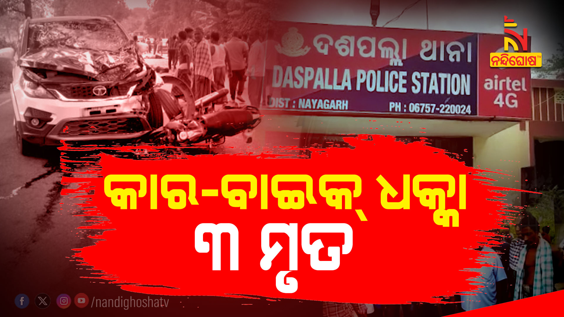ଦଶପଲ୍ଲା: ନୟାଗଡ଼ ଜିଲ୍ଲା ଦଶପଲ୍ଲାରେ ମର୍ମନ୍ତୁଦ ଦୁର୍ଘଟଣା । ମୁହାଁମୁହିଁ ଧକ୍କା ହେଲେ କାର ଓ ବାଇକ୍ । ୩ ବାଇକ୍ ଆରୋହୀଙ୍କ ମୃତ୍ୟୁ । କାର ଆରୋହୀ ଗୁରୁତର । ଉଭୟ ଗାଡି ଦ୍ରୁତଗତିରେ ପରସ୍ପରକୁ ଦେଲେ ଧକ୍କା ।