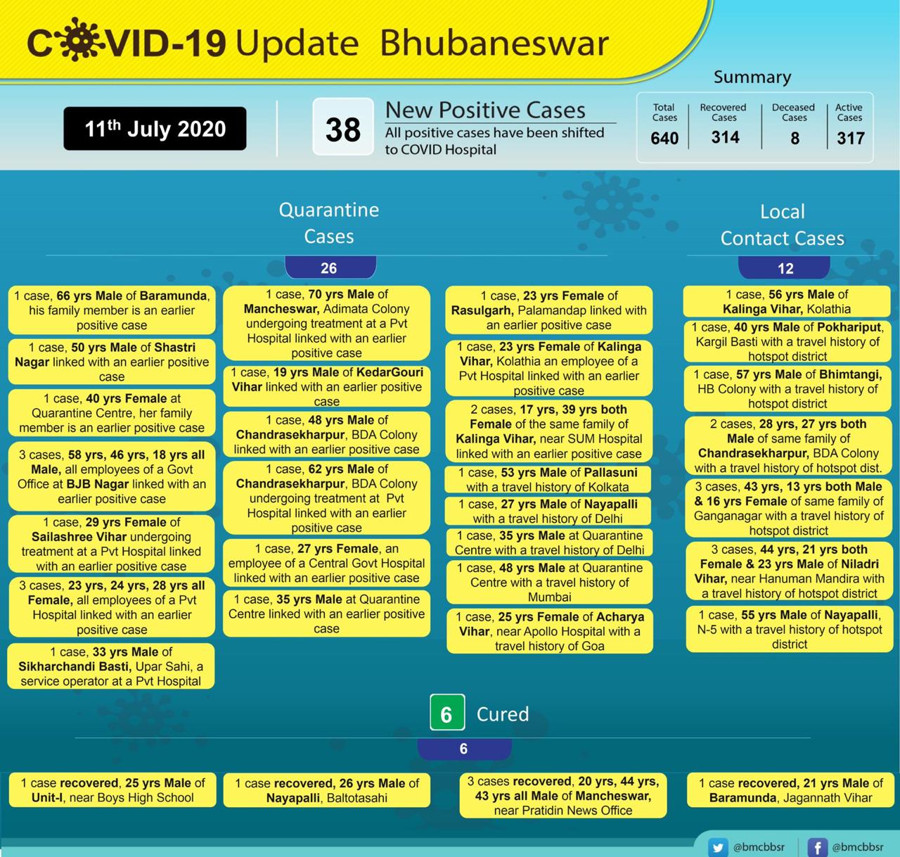 Primary contacts & nearby houses are being quarantined, sanitised & will be under active surveillance. pic.twitter.com/8EeuQXoEJB— BMC (@bmcbbsr) July 11, 2020