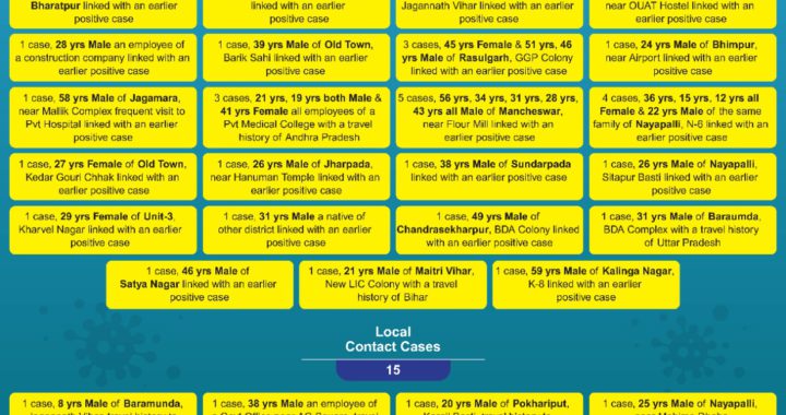 ଭୁବନେଶ୍ୱର: ରାଜଧାନୀ ଭୁବନେଶ୍ୱରରେ ବିଢ଼ିବାରେ ଲାଗିଛି କରୋନା ସଂକ୍ରମଣ । ଦିନକୁ ଦିନ ଭୁବନେଶ୍ୱରରେ ତାର ସଂଖ୍ୟା ବଢ଼ାଉଛି କରୋନା । ସୋମବାର ପୁଣି ୪୯ ଜଣ କରୋନା ସଂକ୍ରମିତ ଚିହ୍ନଟ ହୋଇଛନ୍ତି । ୩୪ ଜଣ କ୍ୱାରେଣ୍ଟାଇନ ସେଣ୍ଟରରୁ ଚିହ୍ନଟ ହୋଇଥିବା ବେଳେ ୧୫ ଜଣଙ୍କ ଲୋକାଲ କଣ୍ଟାକ୍ଟ ରହିଛି । ରାଜଧାନୀରେ ଏପର୍ଯ୍ୟନ୍ତ ମୋଟ ୧୨୩୧ ଜଣ କରୋନା ସଂକ୍ରମିତ ଚିହ୍ନଟ ହୋଇଛନ୍ତି । ସେଥିମଧ୍ୟରୁ ୫୭୬ ଜଣ କରୋତା ରୋଗୀ ସୁସ୍ଥ ହୋଇ … Continue reading କଟକ ଓ ଭୁବନେଶ୍ୱରରୁ ୬୫ ନୂଆ କରୋନା ସଂକ୍ରମିତ ଚିହ୍ନଟ, ବଢ଼ୁଛି ସୁସ୍ଥତା ହାର