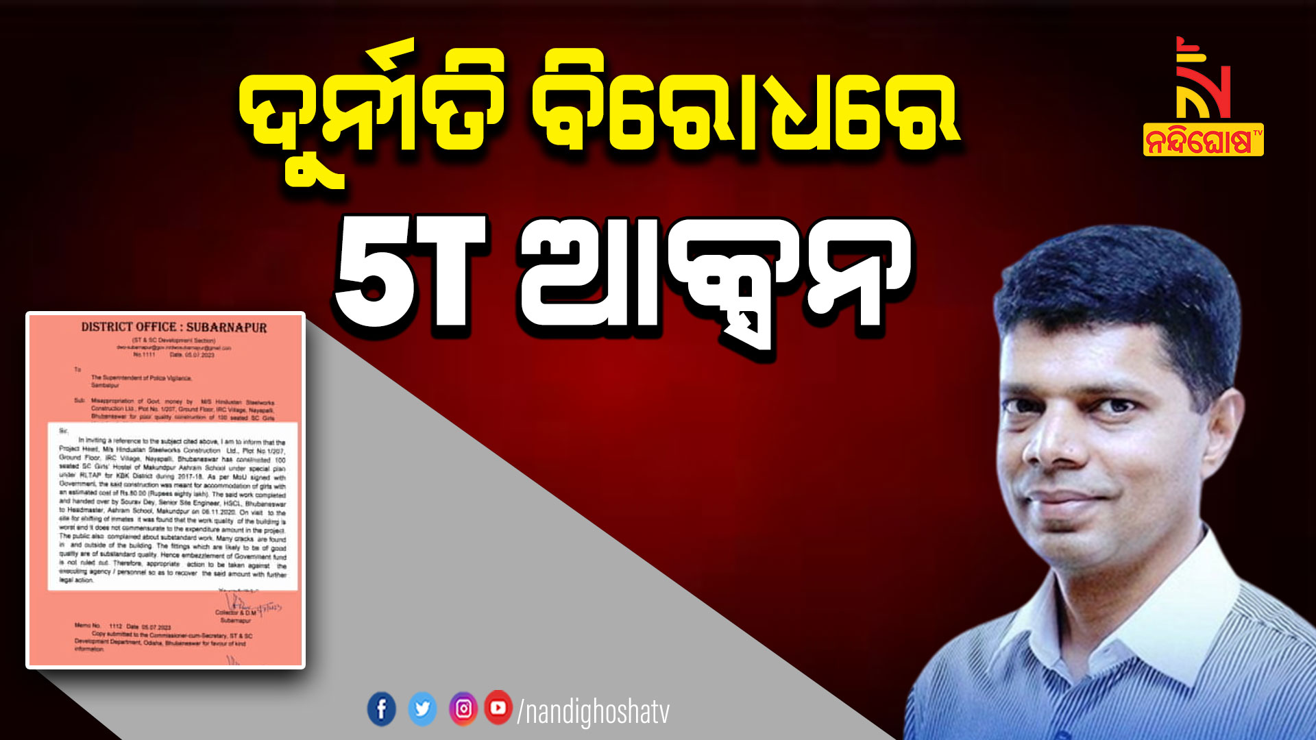 ସୁବର୍ଣ୍ଣପୁର: ଦୁର୍ନୀତି ବିରୋଧରେ 5T ଆକ୍ସନ । ନିମ୍ନମାନର ହଷ୍ଟେଲ ନିର୍ମାଣ କରିଥିବା ସଂସ୍ଥା ବିରୋଧରେ କଡ଼ା ଆଭିମୁଖ୍ୟ । 5T ସଚିବଙ୍କ ନିର୍ଦ୍ଦେଶ ପରେ ତଦନ୍ତ ପାଇଁ ଭିଜିଲାନ୍ସକୁ ଚିଠି ଲେଖିଲେ ସୁବର୍ଣ୍ଣପୁର ଜିଲ୍ଲାପାଳ । ଗତକାଲି ସୁବର୍ଣ୍ଣପୁର ଜିଲ୍ଲା ଗସ୍ତ ସମୟରେ ମକୁନ୍ଦପୁର ୧୦୦ଶଯ୍ୟା ବିଶିଷ୍ଟ ଏସସି ଗାର୍ଲ୍ସ ହଷ୍ଟେଲ ଗସ୍ତ କରିଥିଲେ 5T ସଚିବ ଭି.କେ ପାଣ୍ଡିଆନ । ଏହି ସମୟରେ ୮୦ ଲକ୍ଷ ଟଙ୍କା ବ୍ୟୟରେ ନିର୍ମାଣ ହୋଇଥିବା ହଷ୍ଟେଲ କାମ ନିମ୍ନମାନର ହୋଇଥିବା ଜଳଜଳ ଦେଖାଯାଇଥିଲା। କୋଠାର ଉଭୟ ଭିତରେ ଓ ବାହାରେ ଫାଟ ଦେଖିବାକୁ ମିଳିଥିଲା ।