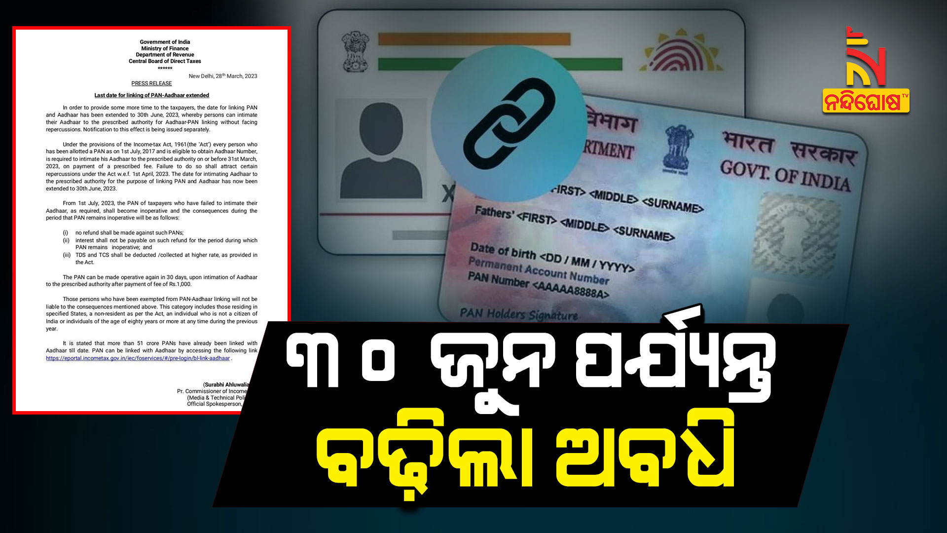 ଆଜି ସିବିଡିଟି ପକ୍ଷରୁ ଜାରି ପ୍ରେସ ବିଜ୍ଞପ୍ତିରେ କୁହାଯାଇଛି ଯେ ଟିକସଦାତାଙ୍କୁ ଆହୁରି ଆଶ୍ୱସ୍ତି ଦେବା ପାଇଁ ପାନ୍ କାର୍ଡ ଏବଂ ଆଧାର କାର୍ଡ ଲିଙ୍କ କରିବାର ଶେଷ ତାରିଖକୁ ୩୦ ଜୁନ ୨୦୨୩ କୁ ବୃଦ୍ଧି କରାଯାଇଛି । ଏହା ପଞ୍ଚମ ଥର ଅଟେ ଯେ ସିବିଡିଟି ପାନ୍ କାର୍ଡକୁ ଆଧାର କାର୍ଡ ସହ ଲିଙ୍କ କରିବାର ଶେଷ ତାରିଖରେ ପରିବର୍ତ୍ତନ କରିଛି । ଯଦି କରଦାତା ୩୦ ଜୁନ ୨୦୨୩ ସୁଦ୍ଧା ନିଜ ପାନ୍ ଏବଂ ଆଧାରକୁ ଲିଙ୍କ କରିବାରେ ଅସଫଳ ରୁହନ୍ତି ତେବେ ତାଙ୍କ ପାନ କାର୍ଡ ନିଷ୍କ୍ରିୟ ହୋଇଯିବ । ଅର୍ଥାତ ଆପଣ ଇନକମ୍ ଟ୍ୟାକ୍ସ ରିଟର୍ଣ୍ଣସ ଫାଇଲ କରିପାରିବେନି ।