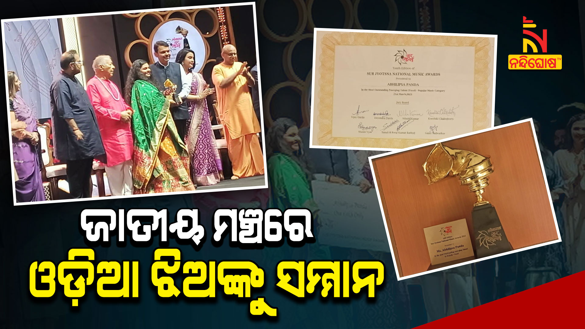 ଭୁବନେଶ୍ୱର: ଜାତୀୟ ମଞ୍ଚରେ ଓଡ଼ିଆ ଝିଅଙ୍କୁ ସମ୍ମାନ । ଇଣ୍ଟରନେଟ୍ ସେନସେସନ ହର ହର ଶମ୍ଭୁ ଫେମ୍ ଅଭିଲିପ୍ସା ପଣ୍ଡାଙ୍କୁ ମିଳିଲା ରାଷ୍ଟ୍ରୀୟ ସଙ୍ଗୀତ ପୁରସ୍କାର । ମୁମ୍ବାଇରେ ଆୟୋଜିତ ସୁର ଜ୍ୟୋସ୍ନା ନ୍ୟାସନାଲ ମ୍ୟୁଜିକ ଆଓ୍ବାର୍ଡରେ ସମ୍ମାନିତ ହୋଇଛନ୍ତି ଅଭିଲିପ୍ସା । ମୋଷ୍ଟ ଆଉଟଷ୍ଟାଣ୍ଡିଂ ଏମର୍ଜିଂ ଟାଲେଣ୍ଟ ଭୋକାଲର ଲୋକପ୍ରିୟ ସଙ୍ଗୀତ କାଟାଗୋରୀରେ ପୁରସ୍କୃତ ହୋଇଛନ୍ତି କେନ୍ଦୁଝର ବଡ଼ବିଲର ଝିଅ ଅଭିଲିପ୍ସା।