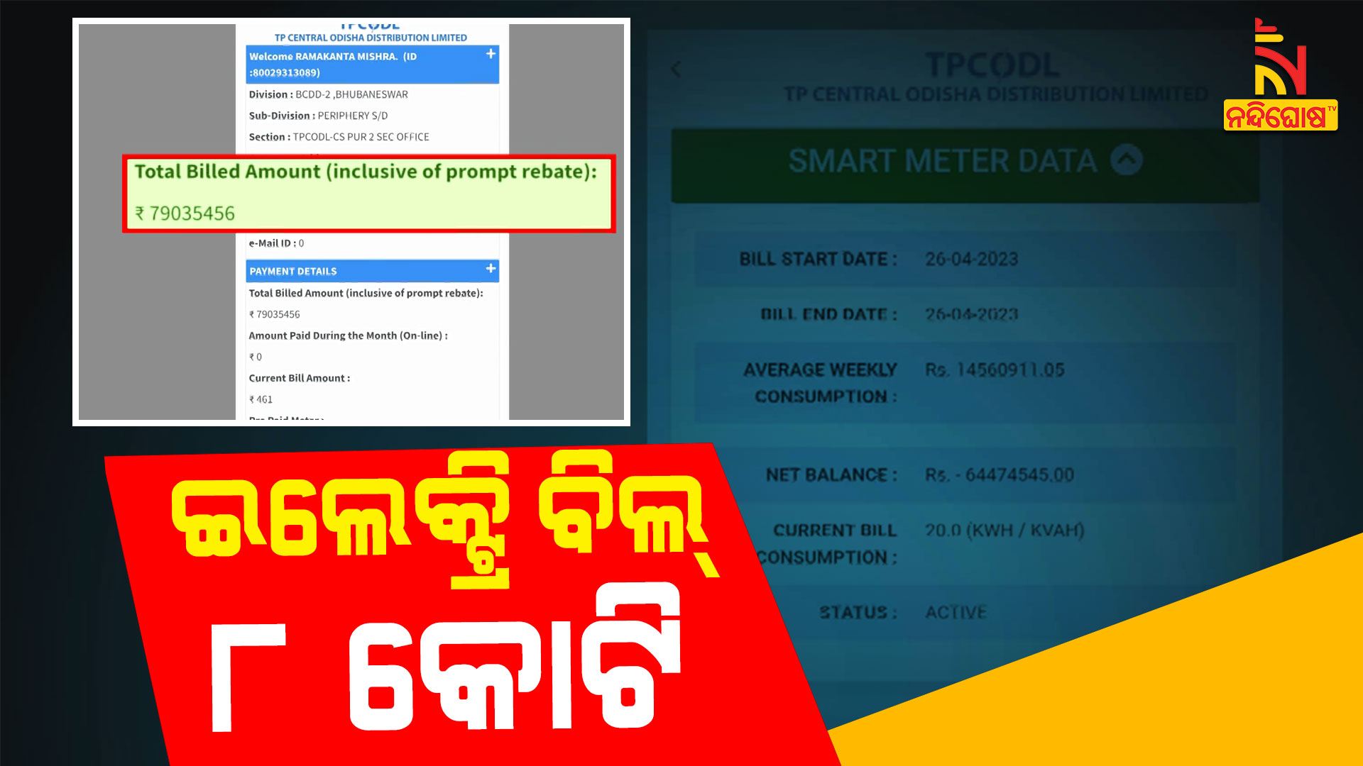 ଭୁବନେଶ୍ୱର: ହୋସ୍ ଉଡାଇଲା ବିଜୁଳି ବିଲ୍ । ଗୋଟିଏ ମାସରେ ବିଜୁଳି ବିଲ୍ ଆସିଲା ୭ କୋଟି ୯୦ ଲକ୍ଷ ୩୫ ହଜାର ୪୫୬ ଟଙ୍କା । ଶୁଣିକି ଆଶ୍ଚର୍ଯ୍ୟ ଲାଗୁଥିଲେ ବି ଏହା ସତ । ଖୋଦ୍ ରାଜଧାନୀ ଭୁବନେଶ୍ୱର ନୀଳାଦ୍ରୀବିହାରରେ ଘଟିଛି ଏଭଳି ଘଟଣା । ଜଣେ ବିଦ୍ୟୁତ ଉପଭୋକ୍ତାଙ୍କର ଏପ୍ରିଲ ମାସରେ ଆସିଛି ପ୍ରାୟ ୮ କୋଟି ବିଲ୍ । ଏକ ମାସର ଏତେ ଟଙ୍କାର ବିଲକୁ ନେଇ ଚିନ୍ତାରେ ବିଦ୍ୟୁତ ଉପଭୋକ୍ତ । ପ୍ଲଟ ନମ୍ବର GA-223 ନୀଳାଦ୍ରୀ ବିହାରରେ ଭଡ଼ାଘରେ ରହୁଥିବା ଦୁର୍ଗା ପ୍ରସାଦ ପଟ୍ଟନାୟକଙ୍କ ଘରୁ ଆସିଛି ଏହି ମୋଟାଅଙ୍କର ବିଲ୍ ।