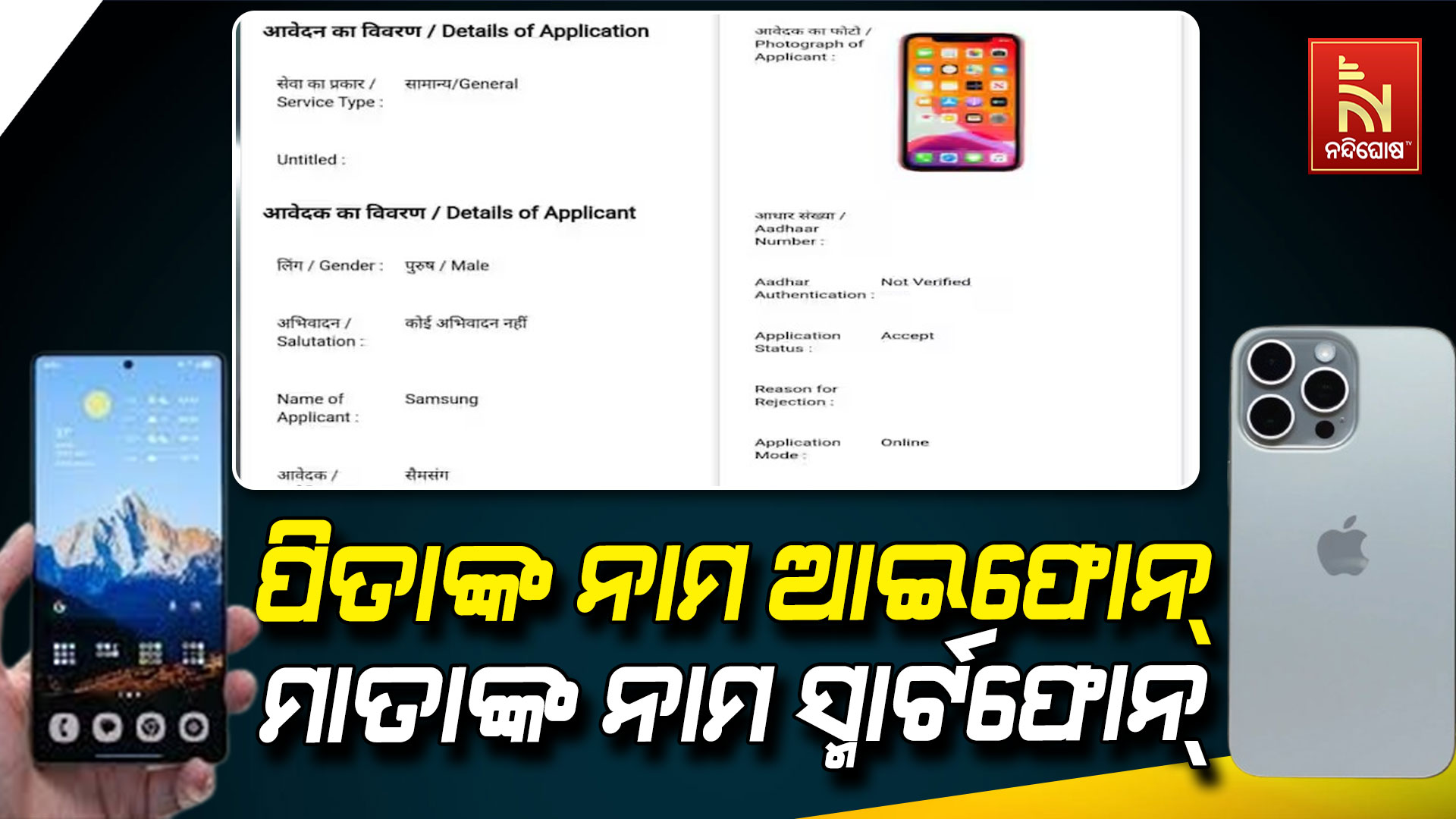 ଜେହାନାବାଦର ମୋଦାନଗଞ୍ଜରେ ଦିଆଯାଇଥିବା ଆବେଦନପତ୍ରରେ, ନାମ, ପିତା ଏବଂ ମାତାଙ୍କ ନାମ ମୋବାଇଲ୍ ବ୍ରାଣ୍ଡ ଉପରେ ଆଧାରିତ। ଆବେଦନକାରୀଙ୍କ ନାମ ସାମସଙ୍ଗ, ପିତାଙ୍କ ନାମ ଆଇଫୋନ୍, ମାତାଙ୍କ ନାମ ସ୍ମାର୍ଟଫୋନ୍, ଠିକଣା ବ୍ୟାଟେରୀ, ପୋଷ୍ଟ ଅଫିସ୍ ଲିଡ୍ ଏବଂ ବ୍ଲକ ହେଉଛି ମୋଦାନଗଞ୍ଜ, ଜିଲ୍ଲା ଜେହାନାବାଦ। ଆବେଦନଟି ଜୋନାଲ ଅଫିସରେ ପହଞ୍ଚିବା ପରେ ଏହି ଘଟଣା ସାମ୍ନାକୁ ଆସିଥିଲା ଏବଂ କର୍ମଚାରୀଙ୍କ ବୁଦ୍ଧି ଯୋଗୁଁ ମାମଲାଟି ଧରାପଡ଼ିଥିଲା।