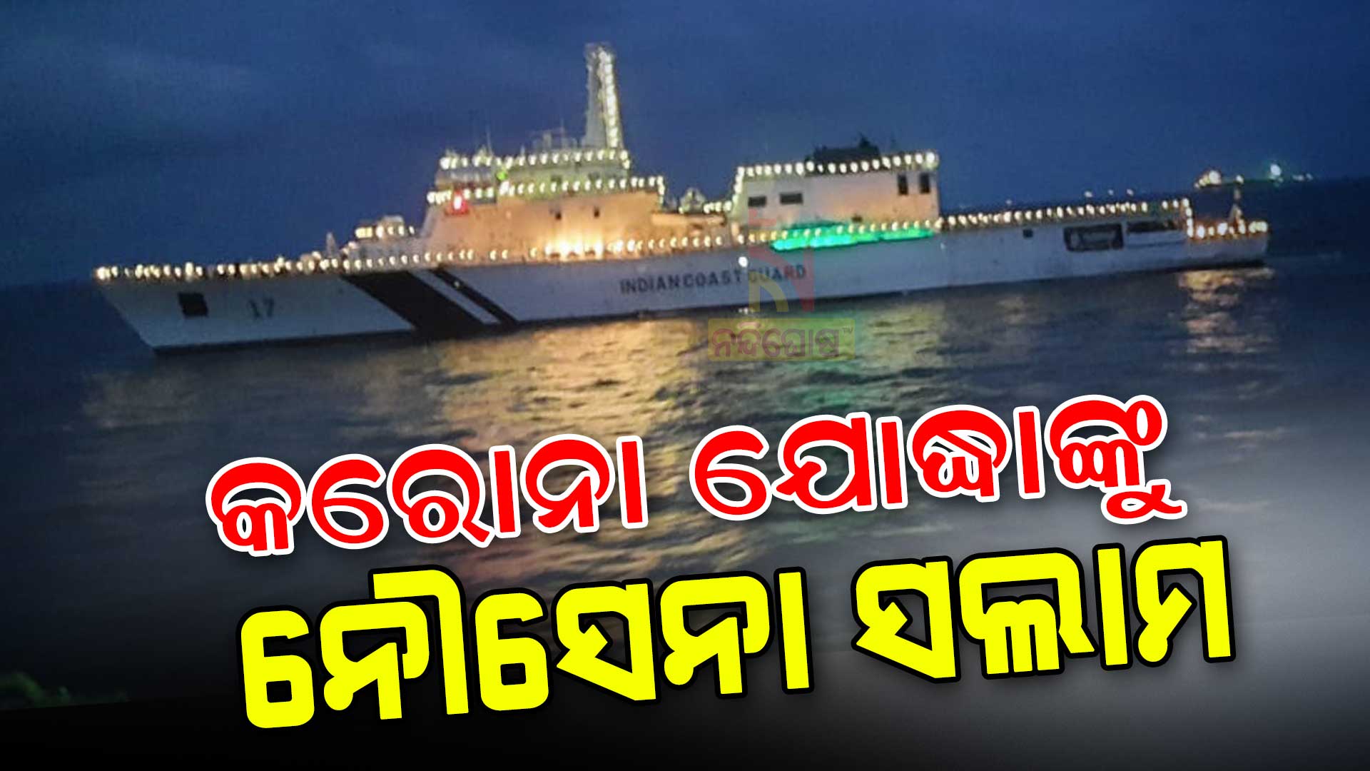 ପୁରୀ: ବାୟୁ ସେନା ପରେ ଏବେ କରୋନା ଯୋଦ୍ଧାଙ୍କୁ ସଲାମ୍‌ ଜଣାଇଛନ୍ତି ନୌସେନା । ବଙ୍ଗୋପ ସାଗରରେ ପୂର୍ବତଟ ତଟରକ୍ଷୀ ବାହିନୀଙ୍କ ପକ୍ଷରୁ ଆଜି ଓଡିଶା ଉପକୂଳରେ କରୋନା ଯୋଦ୍ଧାଙ୍କୁ ସମ୍ମାନ ଜଣାଇ ସମୁଦ୍ର ଭିତରେ ତଟରକ୍ଷୀ ବାହିନୀର ଯୋଦ୍ଧା ଜାହାଜରେ ସବୁଜ ଆଲୋକରେ ଆଲୋକିତ କରାଯାଇଥିଲା | ଏଥିସହ ସମୁଦ୍ର ଭିତରେ ଯୁଦ୍ଧ ଜାହାଜରୁ ସବୁଜ ରଙ୍ଗର ଏଲୁମୁନେସନ ଫ୍ଲେୟାର ମାଧ୍ୟମରେ ଫୁଟାଯାଇ ଯୋଦ୍ଧାଙ୍କୁ ସମ୍ମାନ ପ୍ରଦାନ କରାଯାଇଥିଲା |
