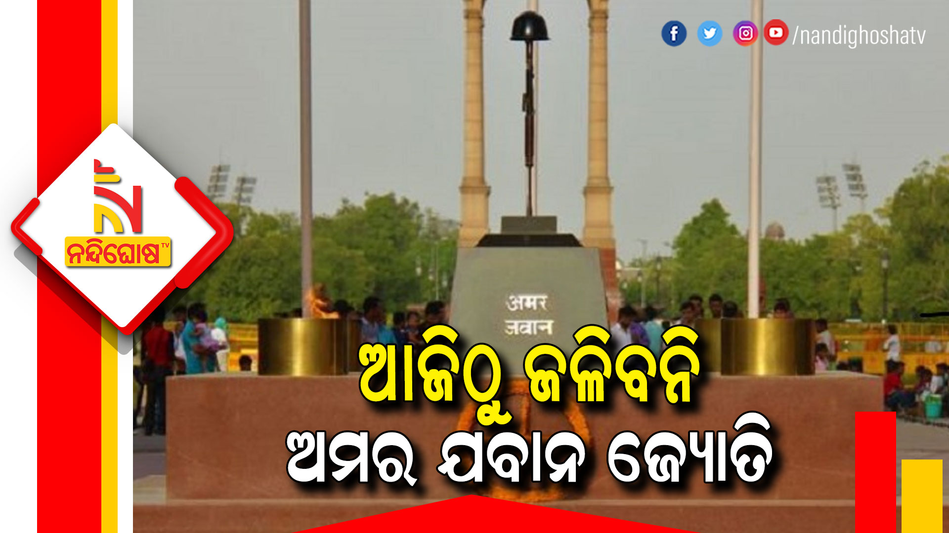ନୂଆଦିଲ୍ଲୀ: ଦିଲ୍ଲୀସ୍ଥିତ ଇଣ୍ଡିଆ ଗେଟରେ ନିର୍ମିତ ଅମର ଯବାନ ଜ୍ୟୋତିରେ ଜଳୁଥିବା ମଶାଲ ସବୁଦିନ ପାଇଁ ଲିଭି ଯିବ । ଏବେ ଏହି ମଶାଲ ନ୍ୟାସନାଲ ଓ୍ବାର ମେମୋରିଆଲ ମଶାଲ ସହ ମିଶି ଜଳିବ । ଆଜି ଅପରାହ୍ଣ ସାଢେ ୩ଟାରେ ଆୟୋଜିତ କାର୍ଯ୍ୟକ୍ରମରେ ଅମର ଯବାନ ଜ୍ୟୋତି ମିଶାଲକୁ ରାଷ୍ଟ୍ରୀୟ ଯୁଦ୍ଧ ସ୍ମାରକୀ ମଶାଲ ସହ ମିଶାଇ ଦିଆଯିବ ।