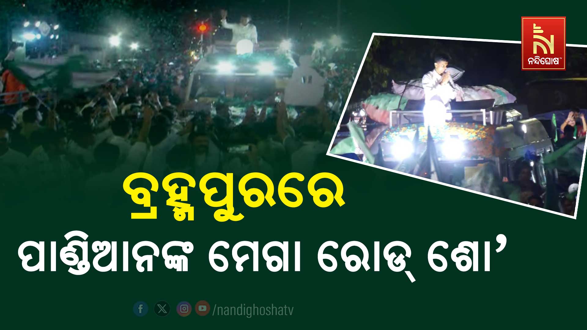 ବ୍ରହ୍ମପୁର: ହଜାର ହଜାର ଲୋକ, ଅସମ୍ଭବ ଭିଡ଼, ବିପୁଳ ଉତ୍ସାହ। ଯୋଡ଼ି ଶଙ୍ଖର ଜଲୱା ସାଙ୍ଗକୁ ବାଜାବାଣର କମ୍ପନ। ବ୍ରହ୍ମପୁରରେ ବିଜେଡି ପାଇଁ ଭଲପାଇବାର ଭିଡ଼। ବିଜେଡି ଷ୍ଟାର ପ୍ରଚାରକ କାର୍ତ୍ତିକ ପାଣ୍ଡିଆନଙ୍କୁ ବିପୁଳ ସମ୍ବର୍ଦ୍ଧନା । ବ୍ରହ୍ମପୁରରେ ବିଶାଳ ରୋଡ ଶୋରେ ଲୋକଙ୍କ ଜବରଦସ୍ତ ରେସପନ୍ସ । ଜନସମୁଦ୍ର ପାଲଟିଲା ବ୍ରହ୍ମପୁର ସହର। ରାସ୍ତାସାରା ଭଲପାଇବା ଓ ସମର୍ଥନର ଅଦ୍ଭୁତପୂର୍ବ ଭିଡ଼ । ସନ୍ଧ୍ଯାରେ ବରିଷ୍ଠ ବିଜେଡି ନେତା ତଥା ବିଜେଡିର ଷ୍ଟାର କ୍ଯାମ୍ପେନର କାର୍ତ୍ତିକ ପାଣ୍ଡିଆନ ବ୍ରହ୍ମପୁରର ଦଳୀୟ ପ୍ରାର୍ଥୀଙ୍କ ପ୍ରଚାର ମଇଦାନକୁ ଓହ୍ଲାଇଥିଲେ। ବିଶାଳ ରୋଡ ଶୋରେ ଜନତାଙ୍କୁ ଉଦବୋଧନ ଦେଇଥିଲେ । ହଜାର ହଜାର ଲୋକ ପାଣ୍ଡିଆନଙ୍କୁ ପାଛୋଟି ନେବା ସହ ନିଜ ନିଜର ଭଲପାଇବା ଓ ଭରସାକୁ ପ୍ରତିପାଦିତ କରିଥିଲେ। ରାସ୍ତାର ଉଭୟ ପାର୍ଶ୍ବରେ ଯୁବକ, ଛାତ୍ର, ମହିଳା ଏକାଠି ହୋଇ ପାଣ୍ଡିଆନଙ୍କୁ ଅପେକ୍ଷା କରିଥିଲେ। ପାଣ୍ଡିଆନଙ୍କ ଉପରକୁ କିଏ ଫୁଲ ସ୍ବାଗତ କରୁଥିଲା ଆଉକିଏ ଯୋଡ଼ି ଶଙ୍ଖ ବଜାଇ।