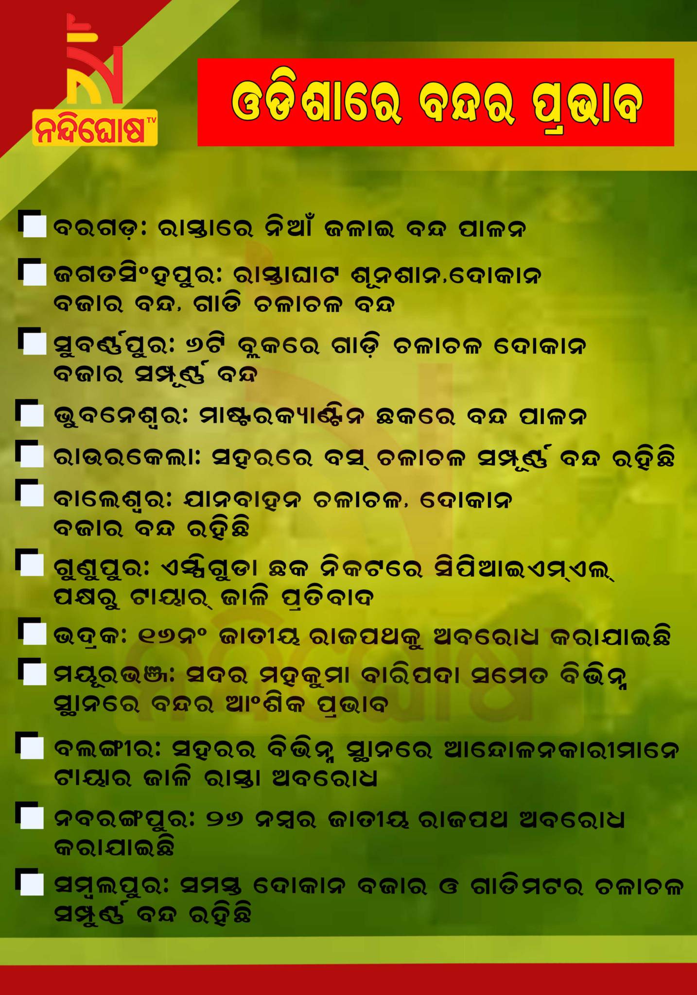 ଭାରତ ବନ୍ଦରେ ଓଡ଼ିଶାରେ କେଉଁ କେଉଁ ସ୍ଥାନରେ କେମିତି ପଡ଼ିଛି ପ୍ରଭାବ ?