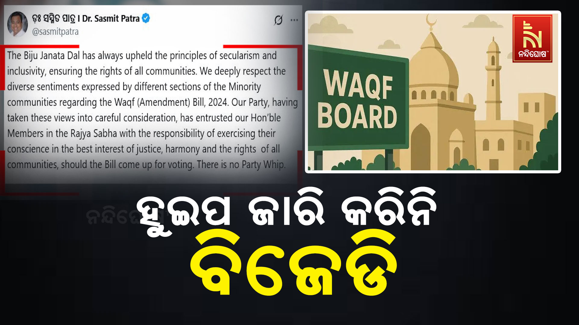 ଭୁବନେଶ୍ବର: ୱାକଫ ବିଲ ନେଇ ରାଜ୍ୟସଭାରେ ହୁଇପ ଜାରି କରି ନାହିଁ ବିଜୁ ଜନତା ଦାଳ । ଏନେଇ ସୂଚନା ଦେଇଛନ୍ତି ଦଳର ବରିଷ୍ଠ ସାଂସଦ ସସ୍ମିତ ପାତ୍ର । ସେ କହିଛନ୍ତି, ଧର୍ମନିରପେକ୍ଷତା ଓ ଅନ୍ତର୍ଭୁକ୍ତିକରଣ ନୀତିକୁ ବିଜୁ ଜନତା ଦଳ ଗୁରୁତ୍ବ ଦେଉଛି । ସମସ୍ତ ସମ୍ପ୍ରଦାୟର ଅଧିକାରର ସୁରକ୍ଷାକୁ ଦଳ ପ୍ରାଧାନ୍ୟ ଦେଉଛି । ଏହାସହ ସଂଖ୍ୟାଲଘୁ ସମ୍ପ୍ରଦାୟର ଭାବନାକୁ ଦଳ ସର୍ବଦା ସମ୍ମାନ ଦେଇଥାଏ ।