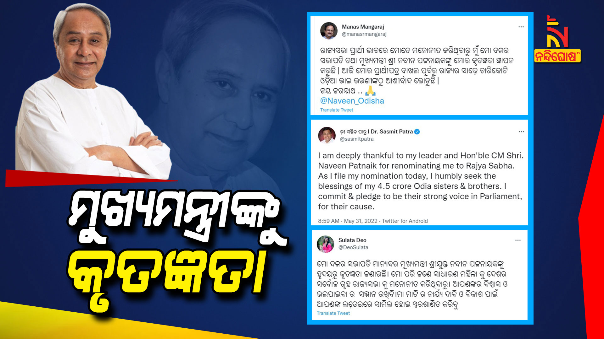 ଭୁବନେଶ୍ୱର: ମୁଖ୍ୟମନ୍ତ୍ରୀ ନବୀନ ପଟ୍ଟନାୟକଙ୍କୁ କୃତଜ୍ଞତା ଜଣାଇଲେ ରାଜ୍ୟସଭା ପ୍ରାର୍ଥୀ । ବିଜୁ ଜନତା ଦଳ ପକ୍ଷରୁ ସେମାନଙ୍କୁ ରାଜ୍ୟସଭା ପ୍ରାର୍ଥୀ କରାଯାଇଥିବାରୁ ମୁଖ୍ୟମନ୍ତ୍ରୀଙ୍କ ପ୍ରତି କୃତଜ୍ଞତା ଜ୍ଞାପନ କରିଛନ୍ତି ସମସ୍ତ ପ୍ରାର୍ଥୀ । ମାନସ ରଞ୍ଜନ ମଙ୍ଗରାଜ ଟ୍ୱିଟ୍ କରି ଲେଖିଛନ୍ତି ଯେ, ‘ରାଜ୍ୟସଭା ପ୍ରାର୍ଥୀ ଭାବରେ ମୋତେ ମନୋନୀତ କରିଥିବାରୁ ମୁଁ ମୋ ଦଳର ସଭାପତି ତଥା ମୁଖ୍ୟମନ୍ତ୍ରୀ ନବୀନ ପଟ୍ଟନାୟକଙ୍କୁ ମୋର କୃତଜ୍ଞତା ଜ୍ଞାପନ କରୁଛି | ଆଜି ମୋର ପ୍ରାର୍ଥୀପତ୍ର ଦାଖଲ ପୂର୍ବରୁ ରାଜ୍ୟର ସାଢ଼େ ଚାରିକୋଟି ଓଡ଼ିଆ ଭାଇ ଭଉଣୀଙ୍କଠୁ ଆଶୀର୍ବାଦ ଲୋଡୁଛି ।’
