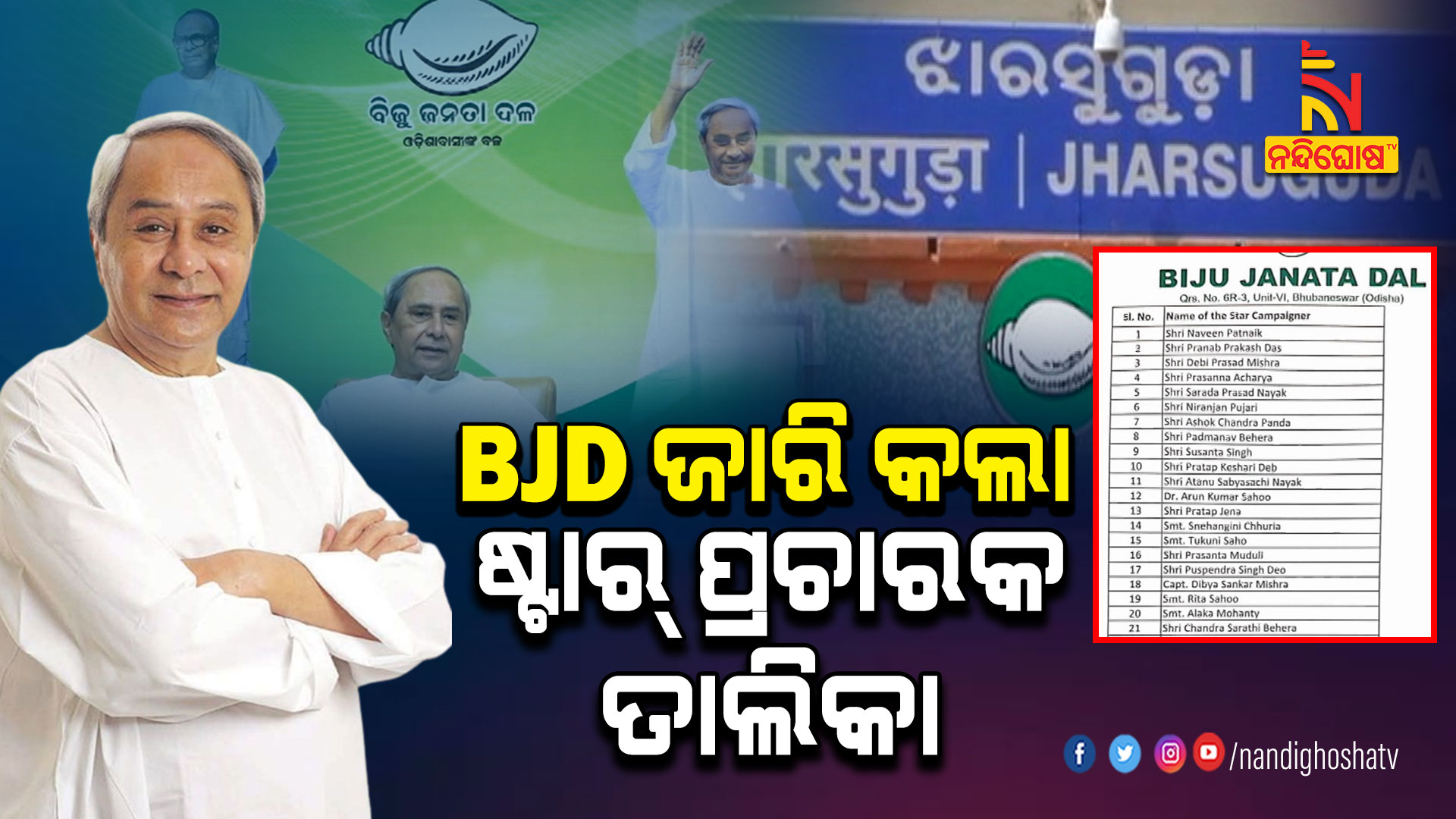 ଭୁବନେଶ୍ୱର: ଝାରସୁଗୁଡ଼ା ପାଇଁ ଷ୍ଟାର କ୍ୟାମ୍ପନରଙ୍କ ତାଲିକା ପ୍ରକାଶ କଲା ବିଜୁ ଜନତା ଦଳ । ଦଳର ସୁପ୍ରିମୋ ତଥା ମୁଖ୍ୟମନ୍ତ୍ରୀ ନବୀନ ପଟ୍ଟନାୟକ ତାଲିକାର ସର୍ବାଗ୍ରେ ରହିଥିବାବେଳେ ଦ୍ୱିତୀୟରେ ଅଛନ୍ତି ଦଳର ସାଙ୍ଗଠନିକ ସମ୍ପାଦକ ପ୍ରଣବ ପ୍ରକାଶ ଦାସ । ଦେବୀ ପ୍ରସାଦ ମିଶ୍ର, ପ୍ରଶନ୍ନ ଆଚାର୍ଯ୍ୟ, ଶାରଦା ପ୍ରସାଦ ନାୟକ, ନିରଞ୍ଜନ ପୂଜାରୀ, ଅଶୋକ ଚନ୍ଦ୍ର ପଣ୍ଡା ଏବଂ ପଦ୍ମନାଭ ବେହେରା ତାଲିକାରେ ରହିଛନ୍ତି ।