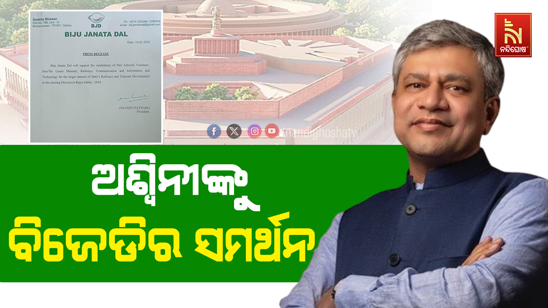 ବ୍ୟୁରୋ ରିପୋର୍ଟ: ବିଜେପି ରାଜ୍ୟସଭା ପ୍ରାର୍ଥୀ ଅଶ୍ଵିନୀ ବୈଷ୍ଣବଙ୍କୁ ସମର୍ଥନ। ସମର୍ଥନ ଘୋଷଣା କଲେ ବିଜେଡି ସୁପ୍ରିମୋ ନବୀନ ପଟ୍ଟନାୟକ। ରାଜ୍ୟର ବୃହତ୍ତର ସ୍ଵାର୍ଥ ଦୃଷ୍ଟିରୁ ସମର୍ଥନ ଘୋଷଣା କରିଛି ବିଜେଡି। ସମର୍ଥନ ନେଇ ବିଜେଡି ପକ୍ଷରୁ ପ୍ରେସ୍ ରିଲିଜ ଜାରି ହୋଇଛି।