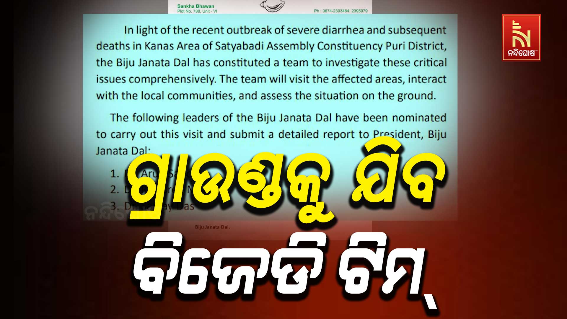 ନନ୍ଦିଘୋଷ ବ୍ୟୁରୋ: ସେପଟେ ସତ୍ୟବାଦୀ ନିର୍ବାଚନ ମଣ୍ଡଳୀର କଣାସ ଅଞ୍ଚଳରେ ବ୍ୟାପିଥିବା ହଇଜାର କାରଣ ଜାଣିବା ପାଇଁ ବିଜେଡି ଏକ ଟିମ୍ ଗଠନ କରିଛି। ବିଧାୟକ ଅରୁଣ ସାହୁ, ପୂର୍ବତନ ସାଂସଦ ରାଜଶ୍ରୀ ମଲ୍ଲିକ ଓ ଡକ୍ଟର ସଞ୍ଜୟ ଦାସଙ୍କୁ ନେଇ ଏକ ୩ ଜଣିଆ ଟିମ୍ ଗଠନ ହୋଇଛି। ବିଜେଡି ସୁପ୍ରିମୋ ନବୀନ ପଟ୍ଟନାୟକଙ୍କ ନିର୍ଦ୍ଦେଶରେ ଏହି ଟିମ୍ ଗଠନ ହୋଇଛି। ଏହି ଟିମ୍ ପ୍ରଭାବିତ ଅଞ୍ଚଳକୁ ଯାଇ ସ୍ଥାନୀୟ ଲୋକଙ୍କ ସହ ଆଲୋଚନା କରିବେ। ଏବଂ ନିର୍ବାଚନ ମଣ୍ଡଳୀର ବିଭିନ୍ନ ଅଞ୍ଚଳ ବୁଲି ସ୍ଥିତି ଅନୁଧ୍ୟାନ କରିବେ। ବିଜେଡି ସମନ୍ବୟ କମିଟି ଅଧ୍ୟକ୍ଷ ଦେବୀ ମିଶ୍ର ଏନେଇ ସୂଚନା ଦେଇଛନ୍ତି।
