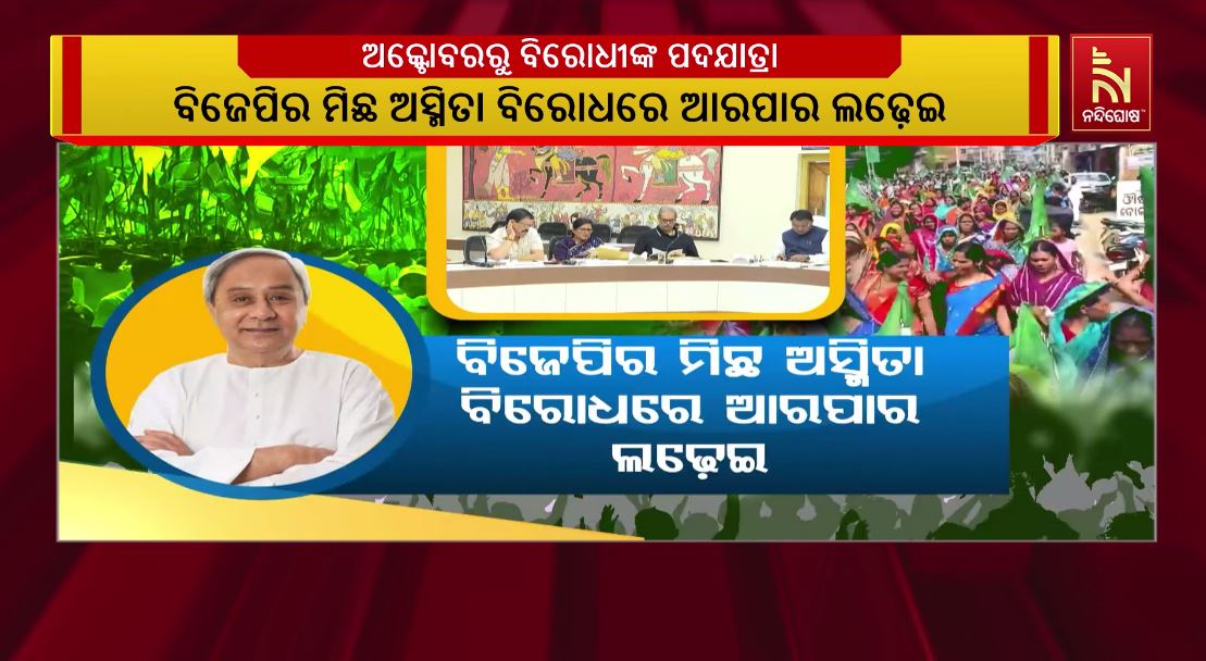 ବିଜେଡି ନେବ ସଙ୍କଳ୍ପ । ବିଜେପିର ମିଛ ଅସ୍ମିତା ବିରୋଧରେ ଆରପାର ଲଢ଼େଇ । ପ୍ରମିଳା କହିଲେ- ପଦଯାତ୍ରାରେ କରାଯିବ ଜନ ସଚେତନ । କଂଗ୍ରେସର ବଦଳିଲା ପଦଯାତ୍ରା କାର୍ଯ୍ୟସୂଚୀ । ଅକ୍ଟୋବର ୯ରୁ ବିଜେଡିର ମାସେବ୍ୟାପୀ ପଦଯାତ୍ରା । ବିଜେପିର ମିଛ ଅସ୍ମିତା ବିରୋଧରେ ଗାଁ ଗାଁରେ କରାଯିବ ଜନ ସଚେତନ। ୧୫ମାସ ଭିତରେ ବିଜେପିର ଓଡିଆ ଅସ୍ମିତା ନାରା ଆଜି କେଉଁଠି ବୋଲି ଶାସକ ଦଳକୁ ପ୍ରଶ୍ନ ପଚାରିବ ଦଳ। ବିରୋଧୀ ଦଳ ମୁଖ୍ୟ ସଚେତକ ପ୍ରମିଳା ମଲ୍ଲିକ କହିଛନ୍ତି- ବିଜେପି ଓଡିଶାବାସୀଙ୍କୁ ମିଛ ଅସ୍ମିତା କଥା କହି ଆଜି ପ୍ରତ୍ୟେକ ଦିନ ଅସ୍ମିତାକୁ କୁଠାରାଘାତ୍ କରୁଛି। ମହିଳାମାନେ ଆଜି ଅସୁରକ୍ଷିତ। ବିଜେପି ସରକାର ପାଇଁ ଓଡିଆ ଅସ୍ମିତା ବିଶ୍ୱରେ ନି ନିନ୍ଦିତ ହୋଇଛି । ଆଡଭାଇଜରୀ ଜାରି କରି ମହିଳାମାନେ ଓଡ଼ିଶା ଗଲେ ସୁରକ୍ଷା ନେଇ ଯିବାକୁ ନିର୍ଦେଶାନାମା ଜାରି କରିଥିଲା ଆମେରିକା। ୧୫ମାସ ଭିତରେ ୩୬ ହଜାର ମହିଳା ନିର୍ଯ୍ୟାତନାର ଶିକାର ହୋଇଛନ୍ତି । ଏସବୁ କଥା ପଦଯାତ୍ରା ଜରିଆରେ ଲୋକଙ୍କୁ ସଚେତନ କରିବ ବିଜେଡି। ଗାନ୍ଧି ଜୟନ୍ତୀରେ ନେଇ ଦଳ ସଂକଳ୍ପ ନେବ ବୋଲି ବିରୋଧୀ ଦଳ ମୁଖ୍ୟ ସଚେତକ ପ୍ରମିଳା ମଲ୍ଲିକ କହିଛନ୍ତି ।