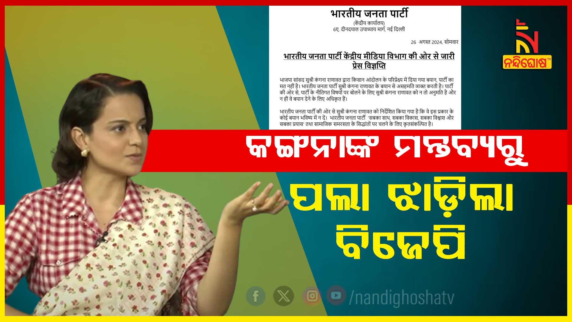 କୃଷକ ଆନ୍ଦୋଳନକୁ ନେଇ କଙ୍ଗନାଙ୍କ ମନ୍ତବ୍ୟରୁ ପଲା ଝାଡ଼ିଲା ବିଜେପି, କହିଲା- ଦଳର ନୀତିଗତ ପ୍ରସଙ୍ଗରେ ବୟାନ ଦେବାକୁ ଅନୁମତି ନାହିଁ