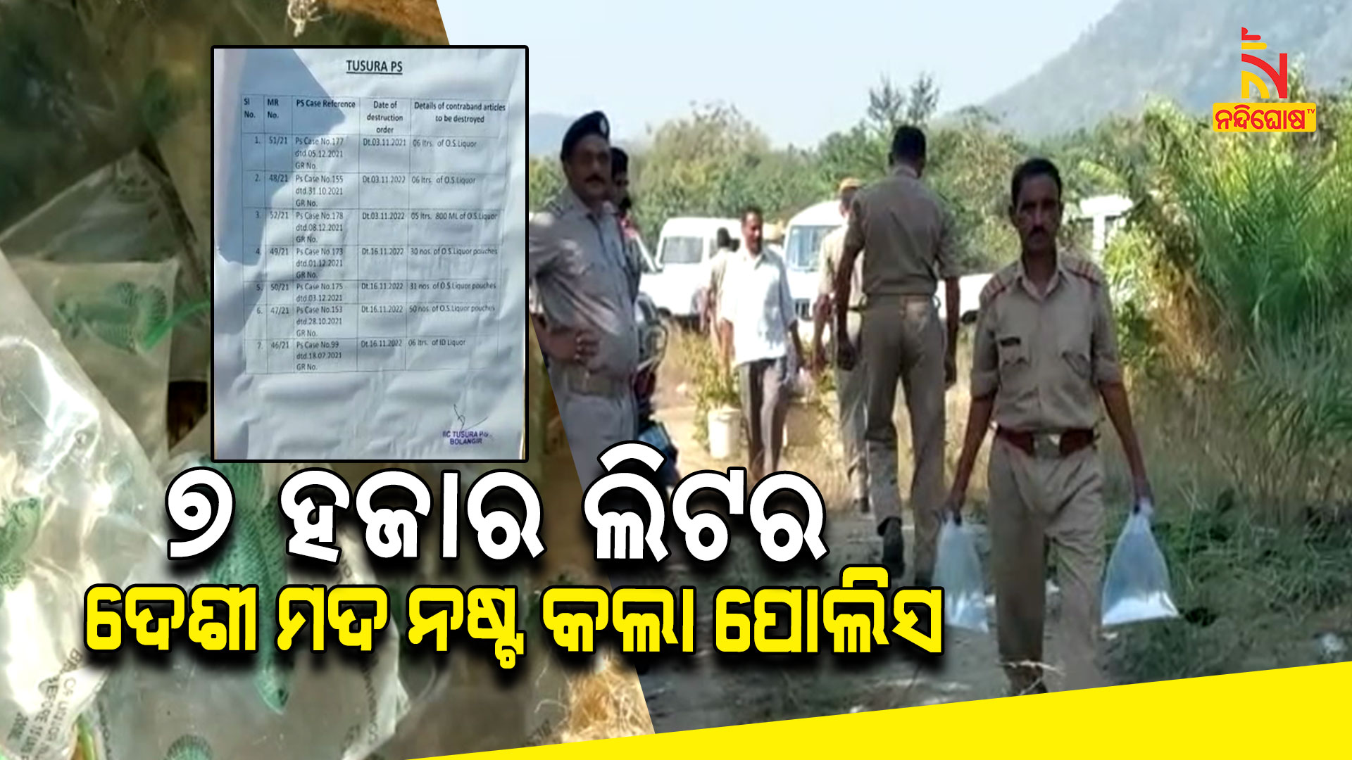 ବଲାଙ୍ଗୀର ଜିଲ୍ଲା ପୋଲିସ ବିଭିନ୍ନ ଥାନାରେ ଜବତ ହୋଇଥିବା ୫୦୮ଟି ମାମଲାରେ ୭ ହଜାର ଲିଟରରୁ ଅଧିକ ଦେଶୀ ମଦକୁ ଏସ୍ପି ଓ ଅବକାରୀ ଅଧୀକ୍ଷକଙ୍କ ଉପସ୍ଥିତିରେ ନଷ୍ଟ କରିଛି ପୋଲିସ । ନଷ୍ଟ କରାଯାଇଥିବା ଜବତ ଦେଶୀ ମଦର ଆନୁମାନିକ ମୂଲ୍ୟ ୬ ଲକ୍ଷରୁ ଅଧିକ ହେବ ବୋଲି ପୋଲିସ ସୂଚନା ଦେଇଛି । ଜିଲ୍ଲାର ୧୭ଟି ଥାନାର ଦେଶୀ ମଦକୁ ଗୋଟିଏ ଜାଗାରେ ରଖି ମଦ ଉପରେ ଜେସିବି ଚଢାଇ ନଷ୍ଟ କରାଯାଇଥିଲା ।