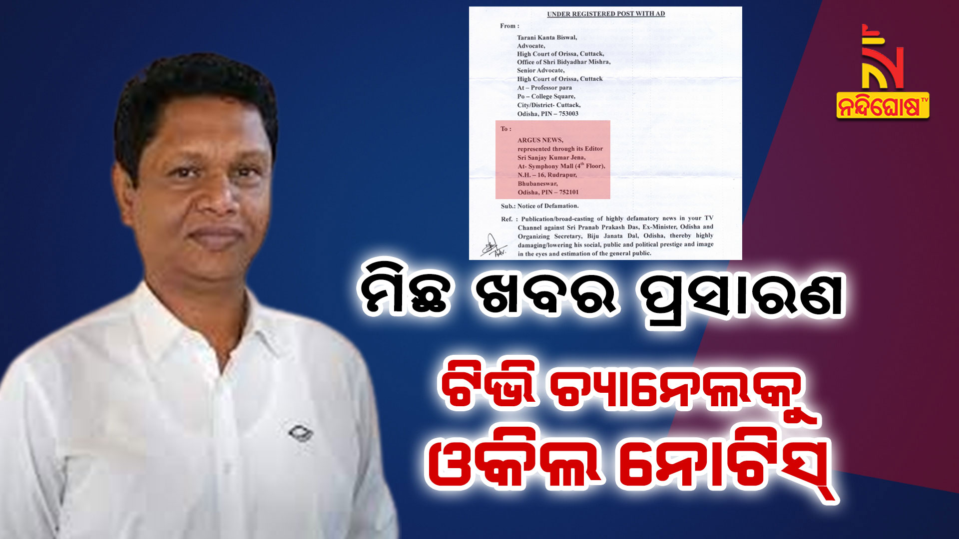 ଭୁବନେଶ୍ବର: ପୂର୍ବତନ ମନ୍ତ୍ରୀ ତଥା ବିଜେଡି ସାଙ୍ଗଠନିକ ସମ୍ପାଦକ ପ୍ରଣବ ପ୍ରକାଶ ଦାସଙ୍କ ବିରୋଧରେ ମିଛ, ଭିତ୍ତିହୀନ ଓ ଅସମ୍ମାନଜନକ ଖବର ପରିବେଷଣ କରିବାରୁ ଏକ ନିର୍ଦ୍ଧିଷ୍ଟ ଓଡ଼ିଆ ଟିଭି ଚ୍ୟାନେଲକୁ ଜାରି ହୋଇଛି ଓକିଲ ନୋଟିସ ।